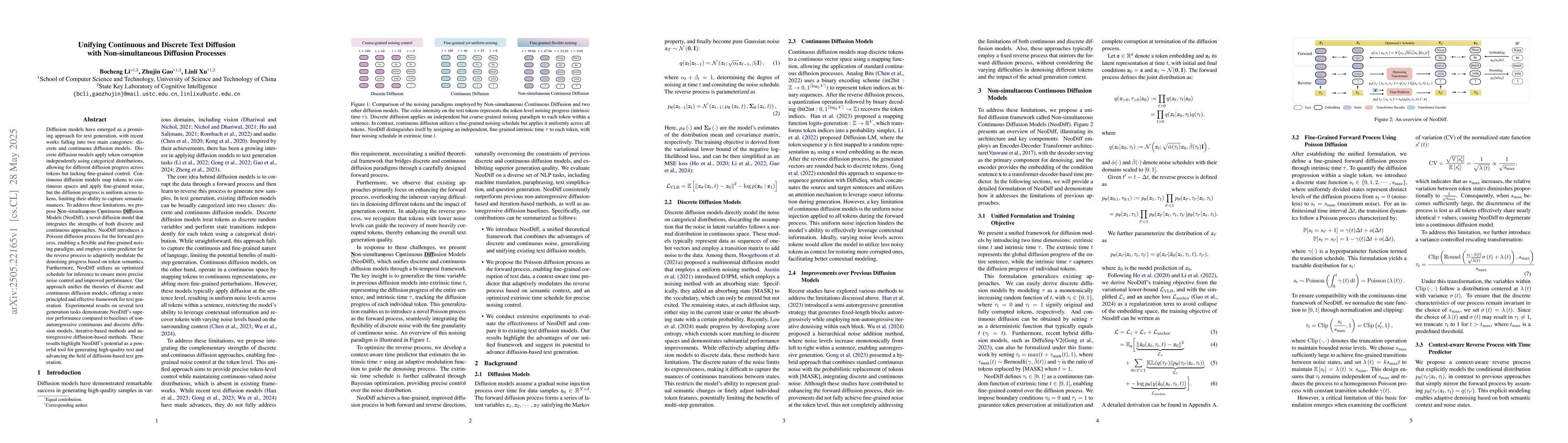 Diffusion models have emerged as a promising approach for text generation, with recent works falling into two main categories: discrete and continuous diffusion models. Discrete diffusion models apply token corruption independently using categorical distributions, allowing for different diffusion progress across tokens but lacking fine-grained control. Continuous diffusion models map tokens to continuous spaces and apply fine-grained noise, but the diffusion progress is uniform across tokens, limiting their ability to capture semantic nuances. To address these limitations, we propose \textbf{\underline{N}}on-simultan\textbf{\underline{e}}ous C\textbf{\underline{o}}ntinuous \textbf{\underline{Diff}}usion Models (NeoDiff), a novel diffusion model that integrates the strengths of both discrete and continuous approaches. NeoDiff introduces a Poisson diffusion process for the forward process, enabling a flexible and fine-grained noising paradigm, and employs a time predictor for the reverse process to adaptively modulate the denoising progress based on token semantics. Furthermore, NeoDiff utilizes an optimized schedule for inference to ensure more precise noise control and improved performance. Our approach unifies the theories of discrete and continuous diffusion models, offering a more principled and effective framework for text generation. Experimental results on several text generation tasks demonstrate NeoDiff's superior performance compared to baselines of non-autoregressive continuous and discrete diffusion models, iterative-based methods and autoregressive diffusion-based methods. These results highlight NeoDiff's potential as a powerful tool for generating high-quality text and advancing the field of diffusion-based text generation.