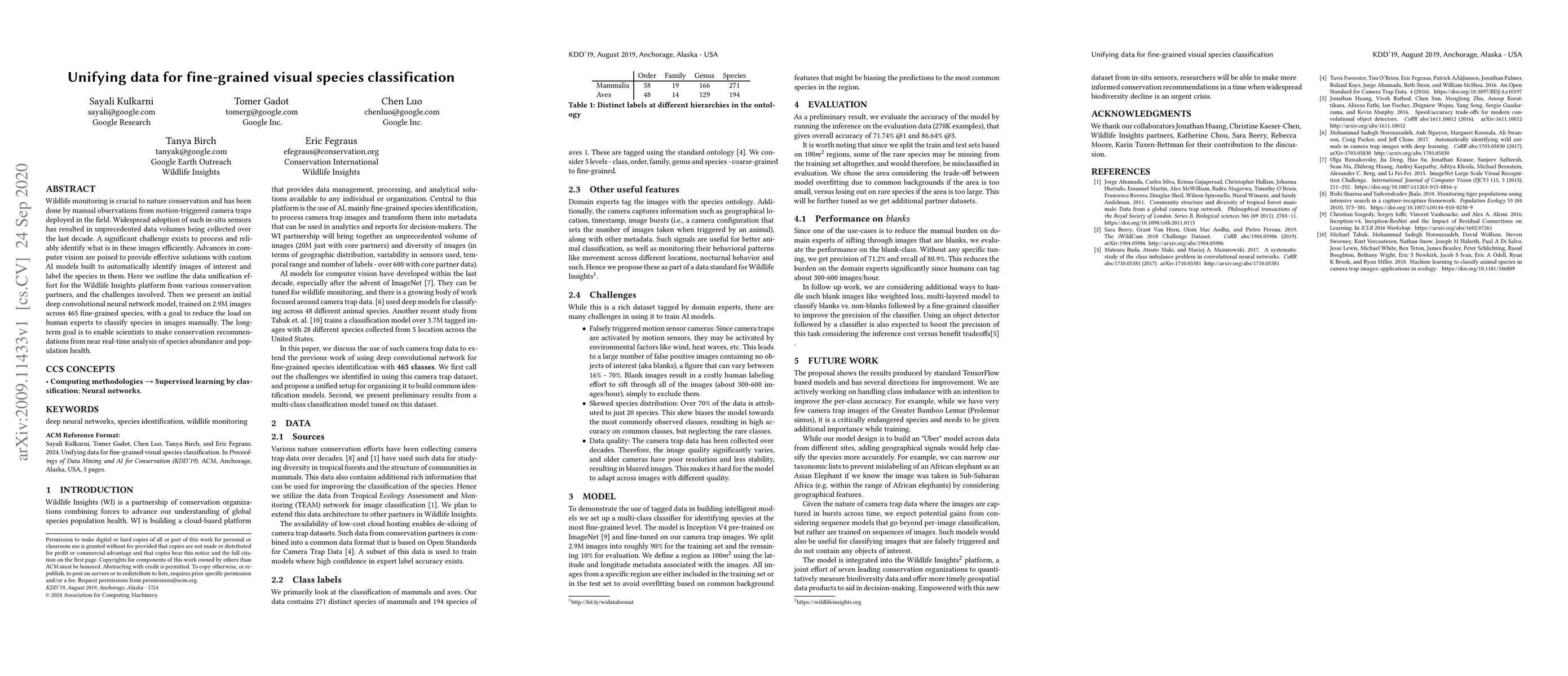 Wildlife monitoring is crucial to nature conservation and has been done by manual observations from motion-triggered camera traps deployed in the field. Widespread adoption of such in-situ sensors has resulted in unprecedented data volumes being collected over the last decade. A significant challenge exists to process and reliably identify what is in these images efficiently. Advances in computer vision are poised to provide effective solutions with custom AI models built to automatically identify images of interest and label the species in them. Here we outline the data unification effort for the Wildlife Insights platform from various conservation partners, and the challenges involved. Then we present an initial deep convolutional neural network model, trained on 2.9M images across 465 fine-grained species, with a goal to reduce the load on human experts to classify species in images manually. The long-term goal is to enable scientists to make conservation recommendations from near real-time analysis of species abundance and population health.