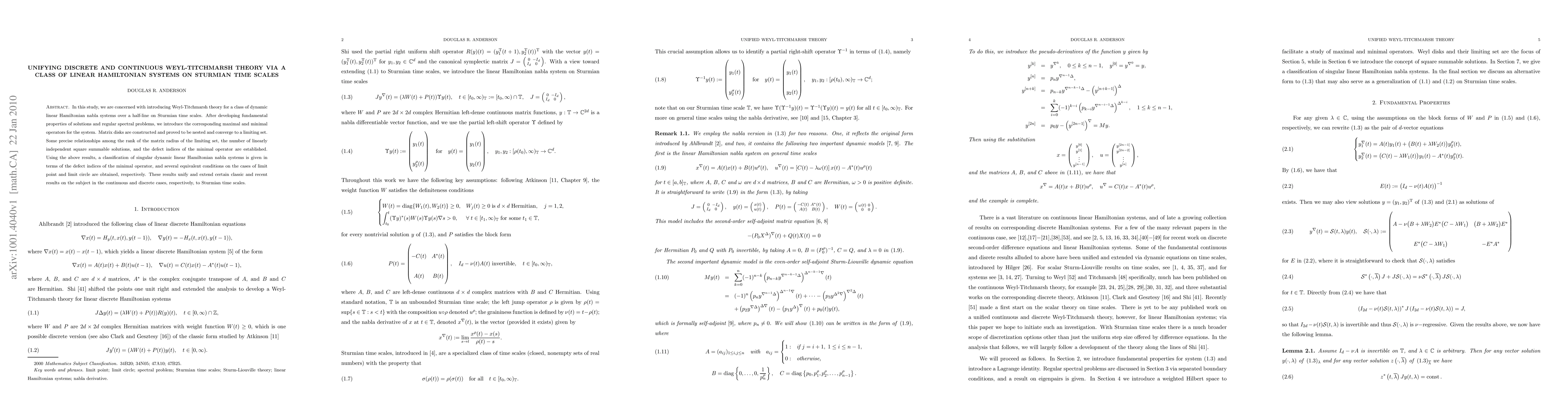 This paper unifies discrete and continuous Weyl-Titchmarsh theory by developing a framework for linear Hamiltonian systems on Sturmian time scales, establishing relationships between spectral properties and defect indices, and classifying singular dynamic systems. The results extend existing theories to new time scales and provide conditions for limit point and limit circle classifications.
