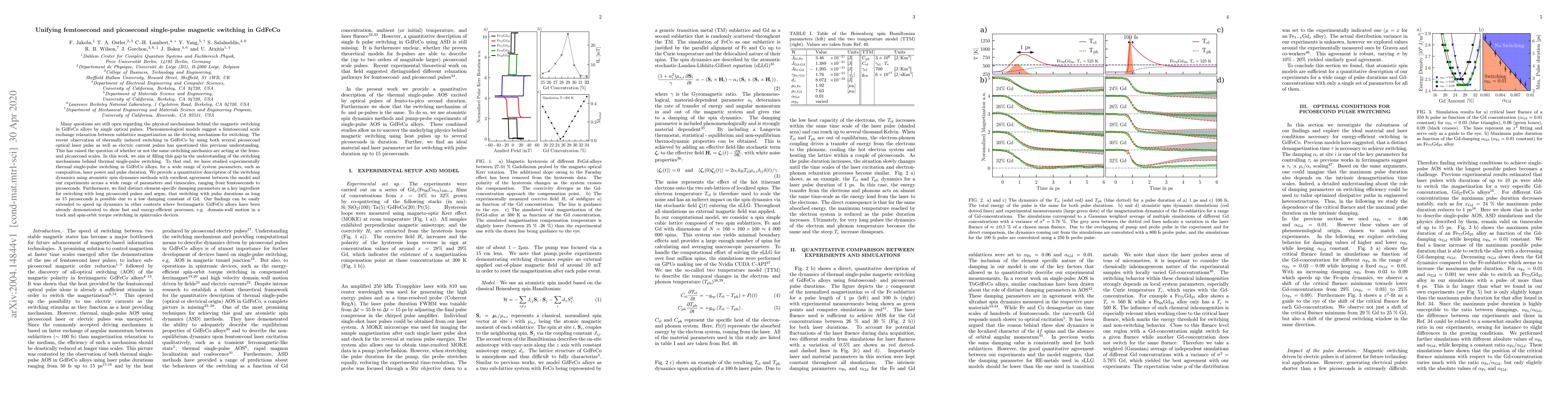 This paper investigates the magnetic switching mechanisms in GdFeCo alloys using both femtosecond and picosecond optical pulses, proposing a unifying model for the switching dynamics across different timescales. Experimental results are quantitatively described using atomistic spin dynamics, revealing distinct element-specific damping parameters crucial for picosecond pulse switching.