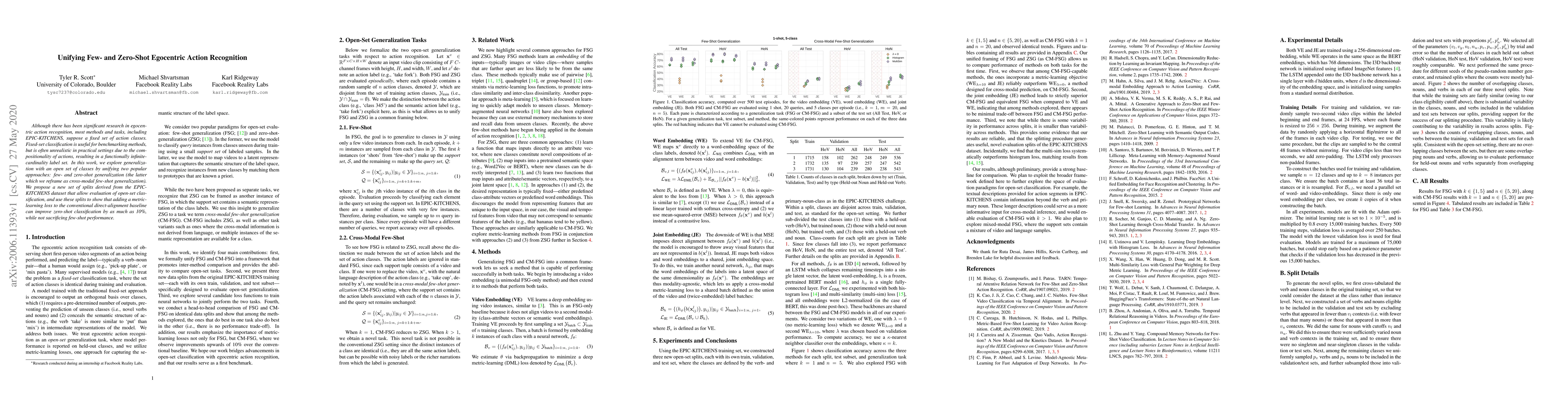 This paper proposes a method to unify few- and zero-shot egocentric action recognition by introducing an open set of classes. It demonstrates that incorporating a metric-learning loss enhances zero-shot classification by 10% without compromising few-shot performance, using new splits from the EPIC-KITCHENS dataset.
