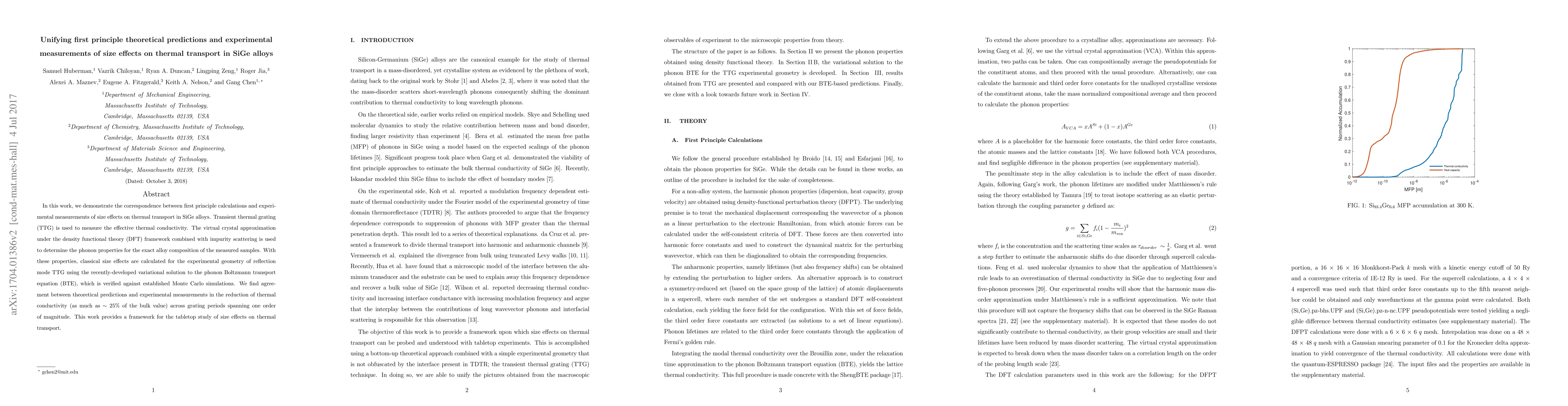 In this work, we demonstrate the correspondence between first principle calculations and experimental measurements of size effects on thermal transport in SiGe alloys. Transient thermal grating (TTG) is used to measure the effective thermal conductivity. The virtual crystal approximation under the density functional theory (DFT) framework combined with impurity scattering is used to determine the phonon properties for the exact alloy composition of the measured samples. With these properties, classical size effects are calculated for the experimental geometry of reflection mode TTG using the recently-developed variational solution to the phonon Boltzmann transport equation (BTE), which is verified against established Monte Carlo simulations. We find agreement between theoretical predictions and experimental measurements in the reduction of thermal conductivity (as much as $\sim$ 25\% of the bulk value) across grating periods spanning one order of magnitude. This work provides a framework for the tabletop study of size effects on thermal transport.