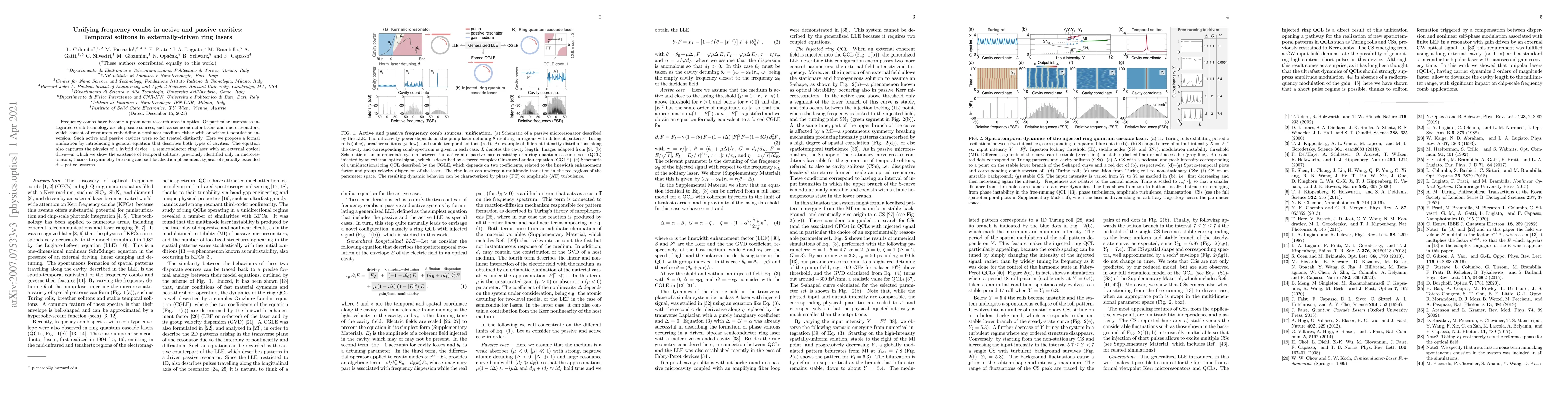 Frequency combs have become a prominent research area in optics. Of particular interest as integrated comb technology are chip-scale sources, such as semiconductor lasers and microresonators, which consist of resonators embedding a nonlinear medium either with or without population inversion. Such active and passive cavities were so far treated distinctly. Here we propose a formal unification by introducing a general equation that describes both types of cavities. The equation also captures the physics of a hybrid device - a semiconductor ring laser with an external optical drive - in which we show the existence of temporal solitons, previously identified only in microresonators, thanks to symmetry breaking and self-localization phenomena typical of spatially-extended dissipative systems.