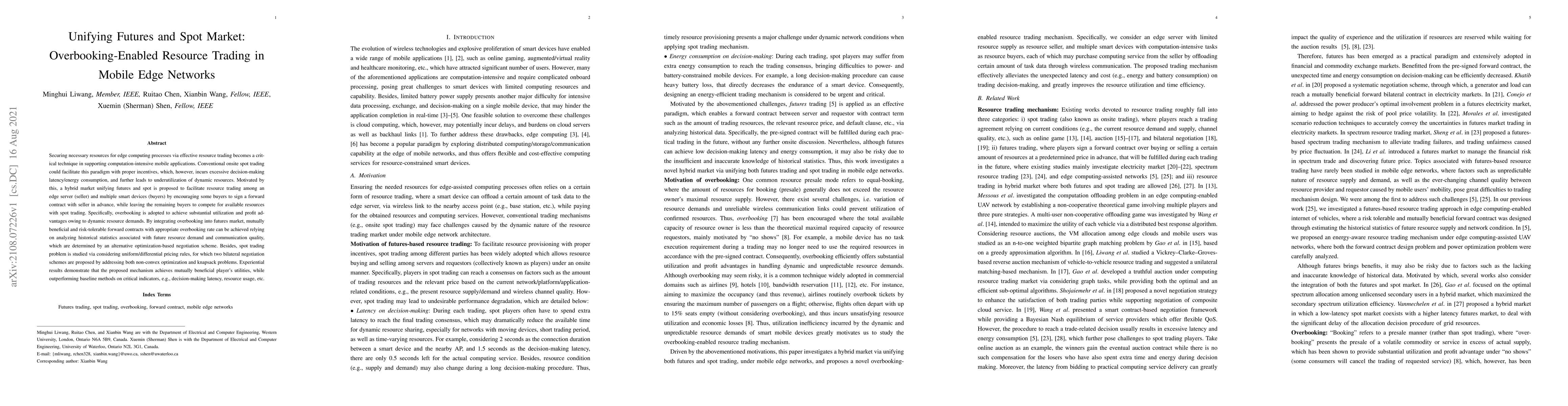 This paper proposes a hybrid market combining futures and spot trading to enhance resource trading in mobile edge networks, addressing latency and energy consumption issues. The approach uses overbooking to optimize resource utilization and profit, leveraging historical data for negotiation and employing two negotiation schemes for pricing rules, ultimately achieving better performance than baseline methods.