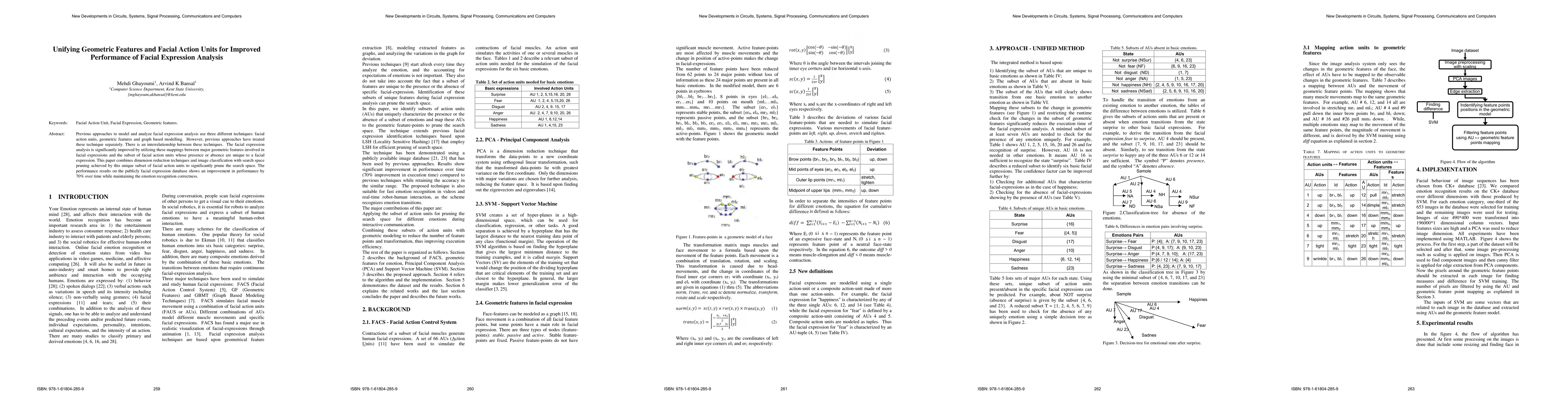 Previous approaches to model and analyze facial expression analysis use three different techniques: facial action units, geometric features and graph based modelling. However, previous approaches have treated these technique separately. There is an interrelationship between these techniques. The facial expression analysis is significantly improved by utilizing these mappings between major geometric features involved in facial expressions and the subset of facial action units whose presence or absence are unique to a facial expression. This paper combines dimension reduction techniques and image classification with search space pruning achieved by this unique subset of facial action units to significantly prune the search space. The performance results on the publicly facial expression database shows an improvement in performance by 70% over time while maintaining the emotion recognition correctness.