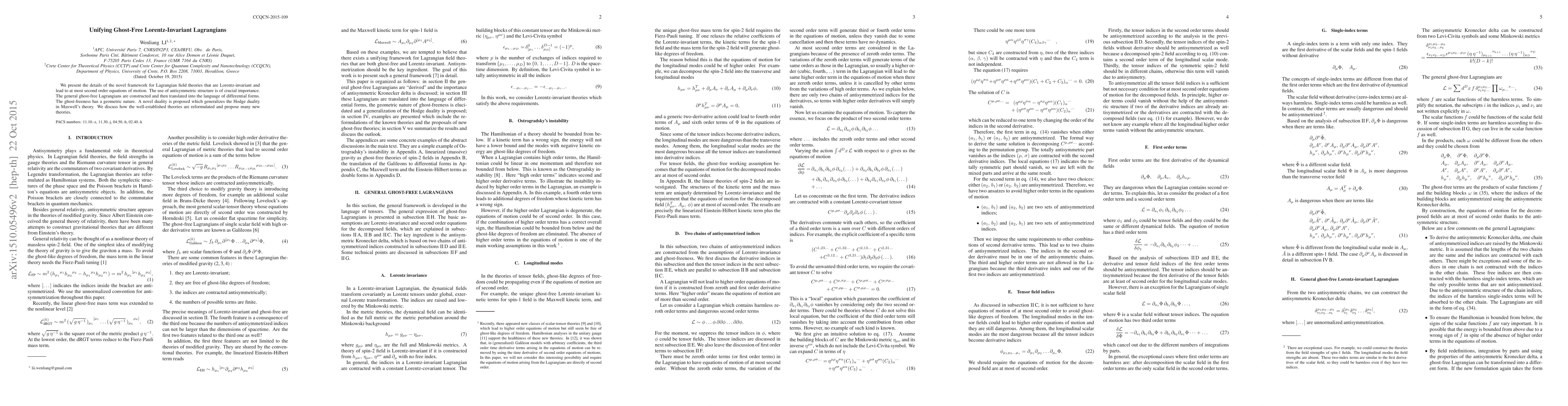 We present the details of the novel framework for Lagrangian field theories that are Lorentz-invariant and lead to at most second order equations of motion. The use of antisymmetric structure is of crucial importance. The general ghost-free Lagrangians are constructed and then translated into the language of differential forms. The ghost-freeness has a geometric nature. A novel duality is proposed which generalizes the Hodge duality in Maxwell's theory. We discuss how the well-established theories are reformulated and propose many new theories.