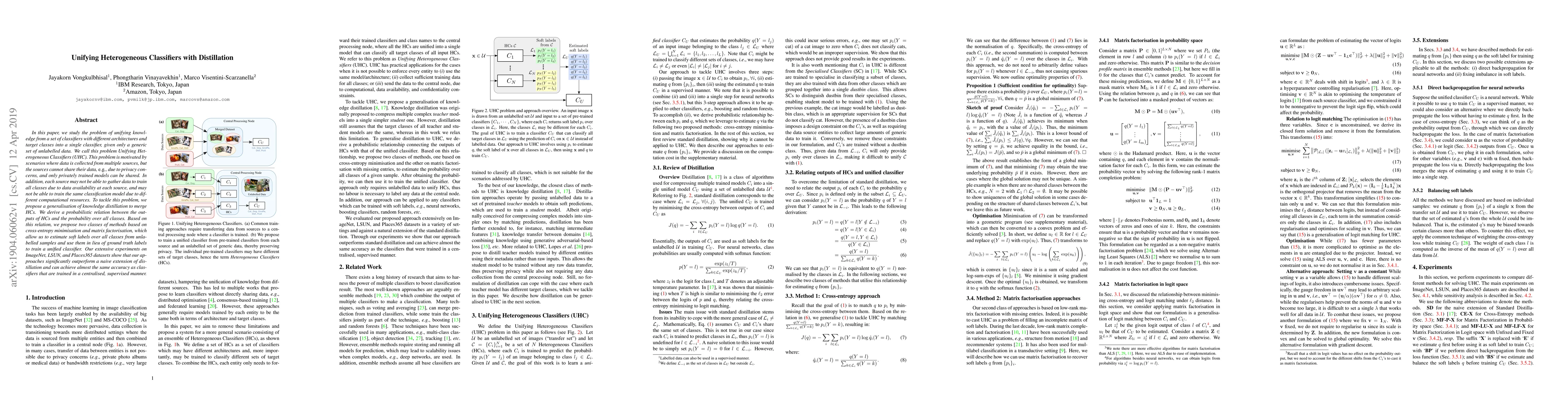 In this paper, we study the problem of unifying knowledge from a set of classifiers with different architectures and target classes into a single classifier, given only a generic set of unlabelled data. We call this problem Unifying Heterogeneous Classifiers (UHC). This problem is motivated by scenarios where data is collected from multiple sources, but the sources cannot share their data, e.g., due to privacy concerns, and only privately trained models can be shared. In addition, each source may not be able to gather data to train all classes due to data availability at each source, and may not be able to train the same classification model due to different computational resources. To tackle this problem, we propose a generalisation of knowledge distillation to merge HCs. We derive a probabilistic relation between the outputs of HCs and the probability over all classes. Based on this relation, we propose two classes of methods based on cross-entropy minimisation and matrix factorisation, which allow us to estimate soft labels over all classes from unlabelled samples and use them in lieu of ground truth labels to train a unified classifier. Our extensive experiments on ImageNet, LSUN, and Places365 datasets show that our approaches significantly outperform a naive extension of distillation and can achieve almost the same accuracy as classifiers that are trained in a centralised, supervised manner.