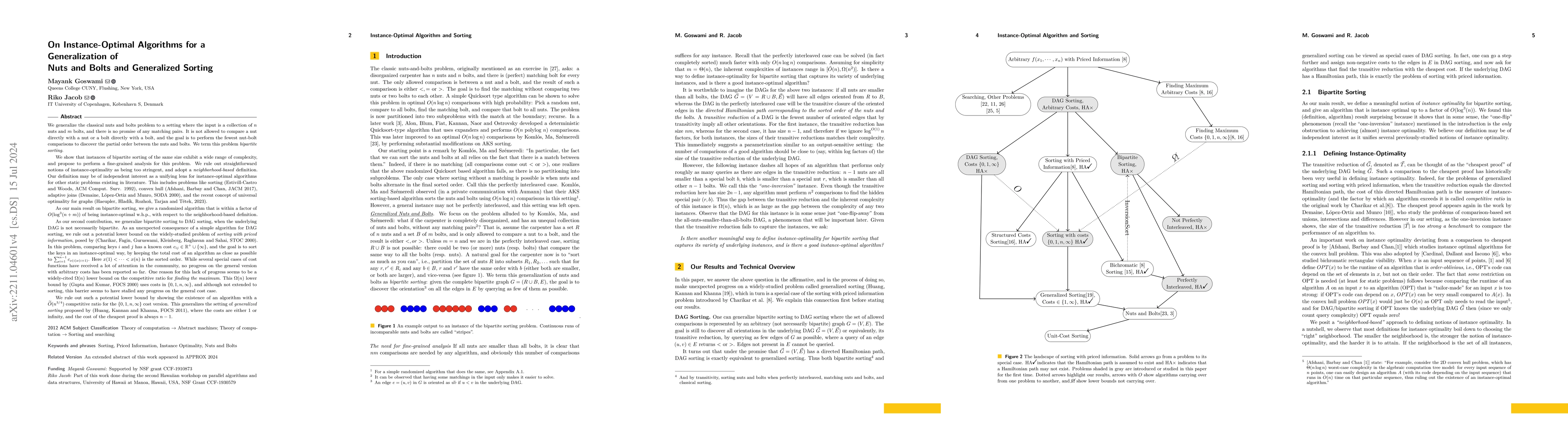 We study the DAG sorting problem: a partial order $\mathcal{P}$ on $n$ keys is to be discovered by querying as few edges of an input graph $G=(V=[n],E)$ as possible. The graph $G$ only contains edges between ordered pairs, and $G$ is promised to contain the transitive reduction of the DAG describing $\mathcal{P}$. We present two technical and one conceptual result. We first show that DAG sorting is closely related to the fundamental problem of sorting with priced information. \emph{Our first technical result} shows the existence of an algorithm with a $\widetilde{O}(n^{3/4})$ competitive ratio for the $\{0,1,n,\infty\}$ cost version. Thus the $\Omega(n)$ lower bound for maximum cannot extend to sorting, reopening the question of the existence of a $o(n)$-competitive algorithm for the general version. \emph{As our main conceptual contribution}, we define a notion of instance-optimality for the specific problem of DAG sorting, and also unify the existing landscape of instance-optimal algorithms for other static problems existing in literature. This includes problems like sorting [Estivill-Castro and Woods, ACM Comput. Surv. 1992], convex hull [Afshani, Barbay and Chan, JACM 2017], and adaptive joins [Demaine, L\'{o}pez-Ortiz and Munro, SODA 2000]. Our unified notion of instance-optimality is also related to FPT algorithms and algorithms with predictions. We consider the special case of DAG sorting where the input graph is bipartite. \emph{As our second technical result}, we show that a recent algorithm for bichromatic sorting [Goswami and Jacob, ITCS 2024] gives an algorithm for bipartite DAG sorting which is instance-optimal to a factor $O(\log^{3}n)$. This generalizes the famous nuts-and-bolts problem to the setting where the number of nuts and bolts are different, and there is no promise of a matching between them, and the resulting order might not be total.