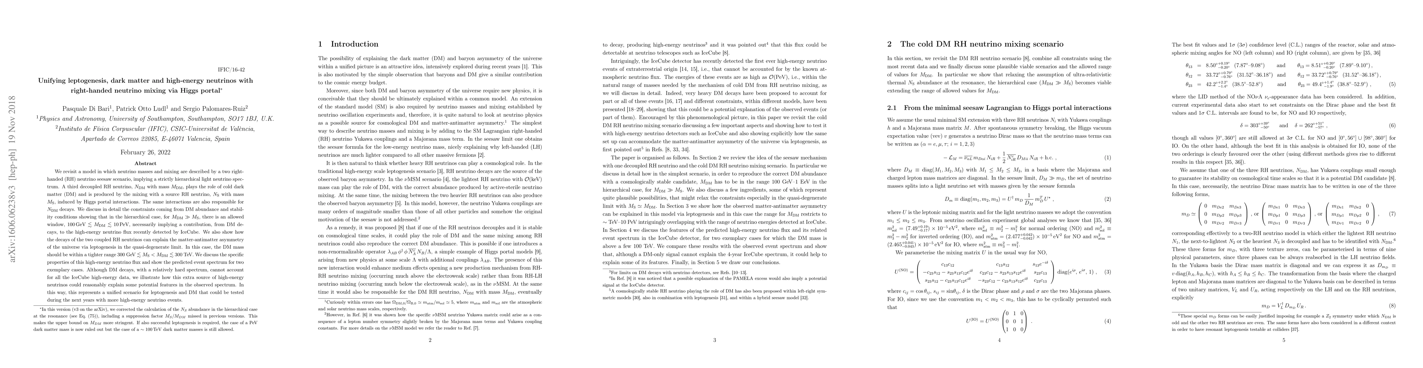 We revisit a model in which neutrino masses and mixing are described by a two right-handed (RH) neutrino seesaw scenario, implying a strictly hierarchical light neutrino spectrum. A third decoupled RH neutrino, $N_{\rm DM}$ with mass $M_{\rm DM}$, plays the role of cold dark matter (DM) and is produced by the mixing with a source RH neutrino, $N_{\rm S}$ with mass $M_{\rm S}$, induced by Higgs portal interactions. The same interactions are also responsible for $N_{\rm DM}$ decays. We discuss in detail the constraints coming from DM abundance and stability conditions, showing that in the hierarchical case ($M_{\rm DM} \gg M_{\rm S}$) there is an allowed window on $M_{\rm DM}$, which necessarily implies a contribution from DM decays to the high-energy neutrino flux recently detected by IceCube. We also show how the model can explain the matter-antimatter asymmetry of the Universe via leptogenesis in the quasi-degenerate limit. In this case, the DM mass should be within the range 300 GeV $\lesssim M_{\rm S} < M_{\rm DM} \lesssim$ 10 PeV. We discuss the specific properties of this high-energy neutrino flux and show the predicted event spectrum for two exemplary cases. Although DM decays, with a relatively hard spectrum, cannot account for all the IceCube high-energy data, we illustrate how this extra source of high-energy neutrinos could reasonably explain some potential features in the observed spectrum. In this way, this represents a unified scenario for leptogenesis and DM that could be tested during the next years with more high-energy neutrino events.