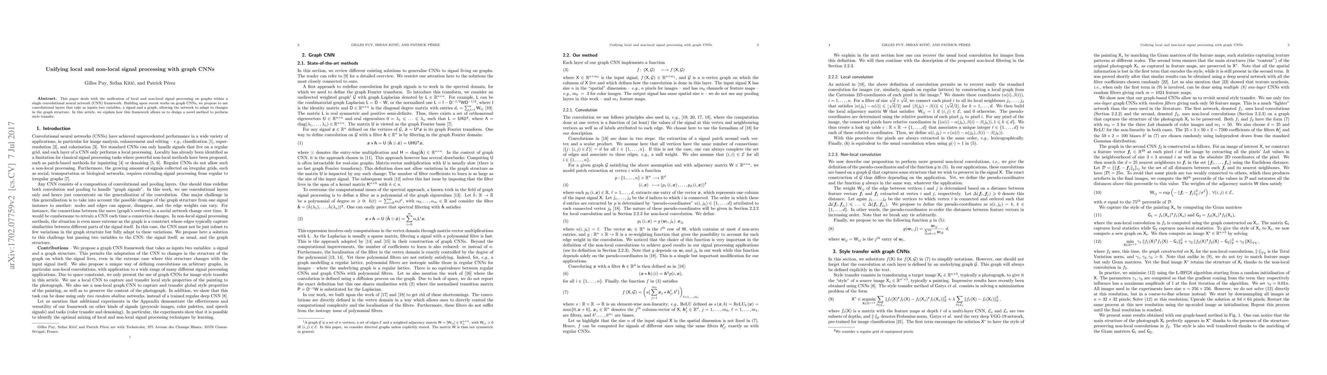 This paper deals with the unification of local and non-local signal processing on graphs within a single convolutional neural network (CNN) framework. Building upon recent works on graph CNNs, we propose to use convolutional layers that take as inputs two variables, a signal and a graph, allowing the network to adapt to changes in the graph structure. In this article, we explain how this framework allows us to design a novel method to perform style transfer.
