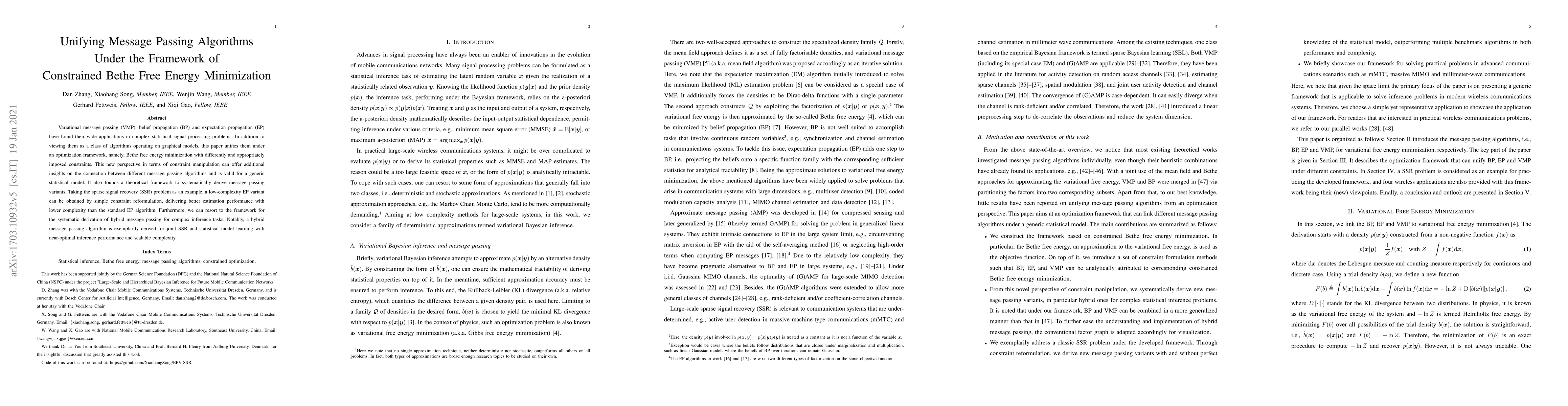 This paper unifies variational message passing, belief propagation, and expectation propagation under Bethe free energy minimization with imposed constraints, offering insights into their connections and enabling the derivation of new message passing variants. A low-complexity variant for sparse signal recovery demonstrates improved performance and efficiency.