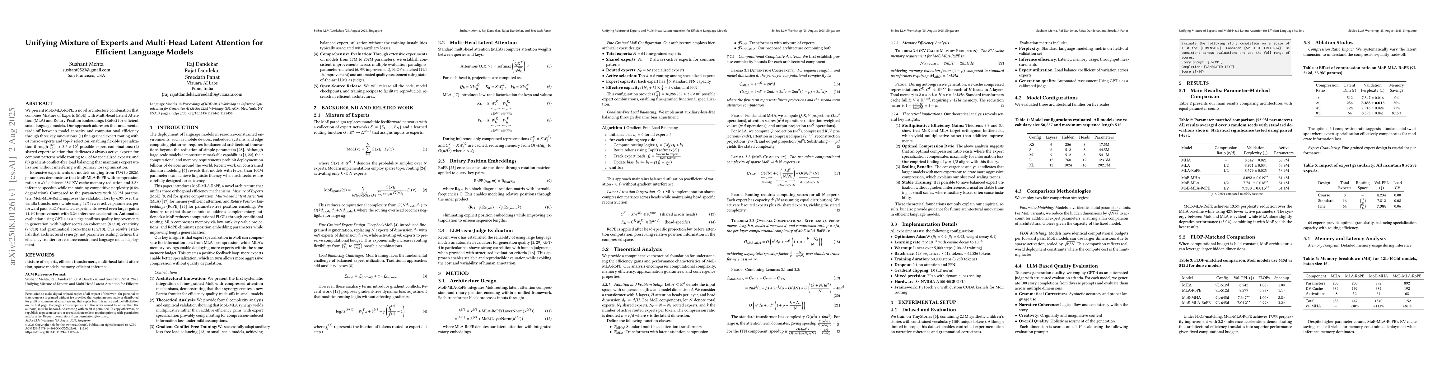 We present MoE-MLA-RoPE, a novel architecture combination that combines Mixture of Experts (MoE) with Multi-head Latent Attention (MLA) and Rotary Position Embeddings (RoPE) for efficient language modeling. Our approach addresses the fundamental trade-off between model capacity and computational efficiency through three key innovations: (1) fine-grained expert routing with 64 micro-experts and top-$k$ selection, enabling flexible specialization through 3.6 * 10^7 possible expert combinations; (2) shared expert isolation that dedicates 2 always active experts for common patterns while routing to 6 of 62 specialized experts; and (3) gradient-conflict-free load balancing that maintains expert utilization without interfering with primary loss optimization. Extensive experiments on models ranging from 17M to 202M parameters demonstrate that MoE-MLA-RoPE with compression ratio r=d/2 achieves 68% KV cache memory reduction and 3.2x inference speedup while maintaining competitive perplexity (0.8% degradation). Compared to the parameters with 53.9M parameters, MoE-MLA-RoPE improves the validation loss by 6.9% over the vanilla transformers while using 42% fewer active parameters per forward pass. FLOP-matched experiments reveal even larger gains: 11.1% improvement with 3.2x inference acceleration. Automated evaluation using GPT-4 as a judge confirms quality improvements in generation, with higher scores on coherence (8.1/10), creativity (7.9/10) and grammatical correctness (8.2/10). Our results establish that architectural novelty, not parameter scaling, defines the efficiency frontier for resource-constrained language model deployment.