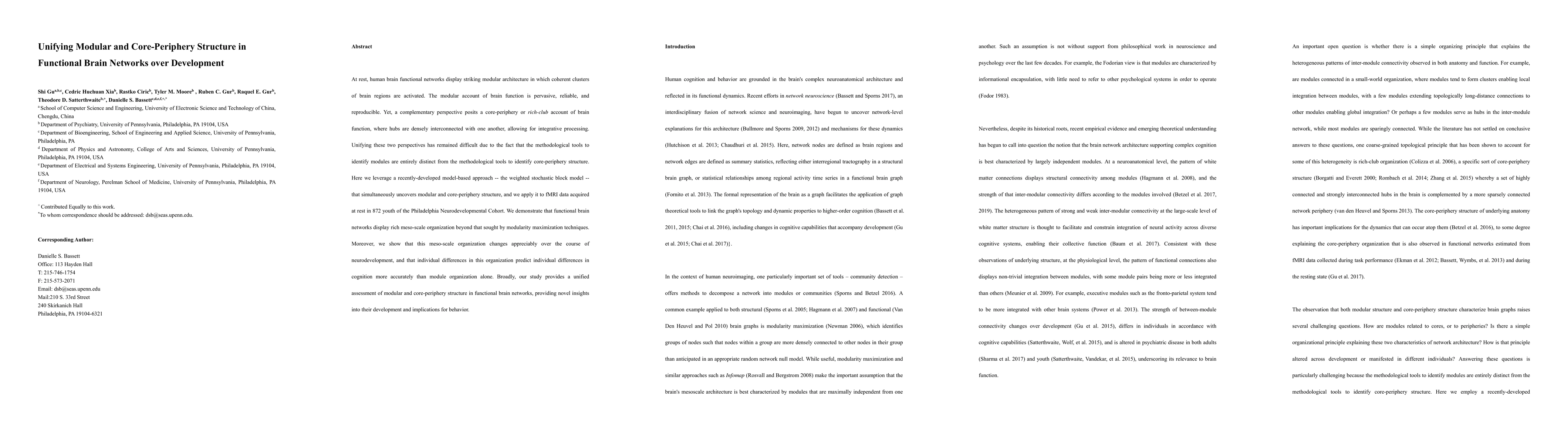 At rest, human brain functional networks display striking modular architecture in which coherent clusters of brain regions are activated. The modular account of brain function is pervasive, reliable, and reproducible. Yet, a complementary perspective posits a core-periphery or rich-club account of brain function, where hubs are densely interconnected with one another, allowing for integrative processing. Unifying these two perspectives has remained difficult due to the fact that the methodological tools to identify modules are entirely distinct from the methodological tools to identify core-periphery structure. Here we leverage a recently-developed model-based approach -- the weighted stochastic block model -- that simultaneously uncovers modular and core-periphery structure, and we apply it to fMRI data acquired at rest in 872 youth of the Philadelphia Neurodevelopmental Cohort. We demonstrate that functional brain networks display rich meso-scale organization beyond that sought by modularity maximization techniques. Moreover, we show that this meso-scale organization changes appreciably over the course of neurodevelopment, and that individual differences in this organization predict individual differences in cognition more accurately than module organization alone. Broadly, our study provides a unified assessment of modular and core-periphery structure in functional brain networks, providing novel insights into their development and implications for behavior.