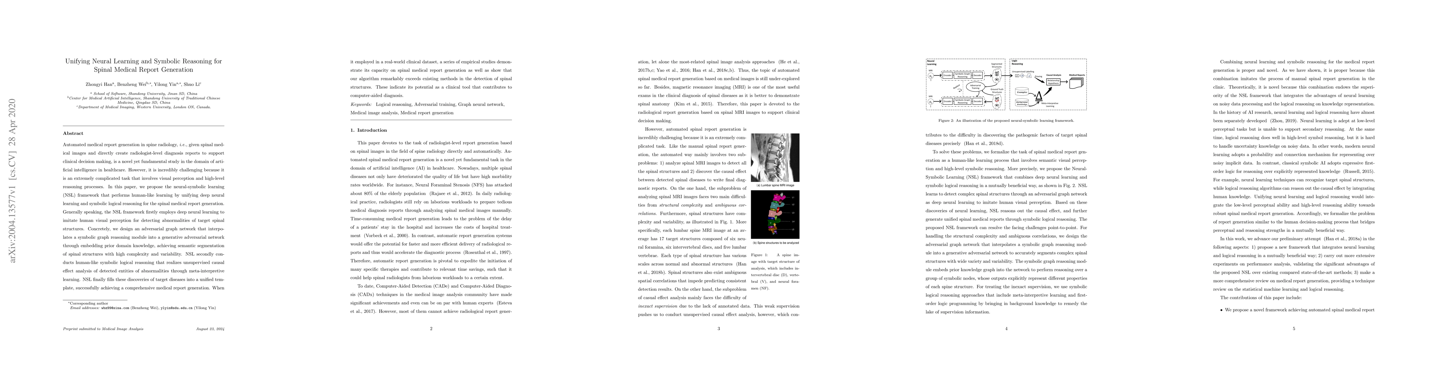 This paper proposes a neural-symbolic learning framework to generate radiologist-level spinal medical reports by combining deep neural learning for visual perception and symbolic reasoning for logical analysis, outperforming existing methods in spinal structure detection. The framework uses an adversarial graph network to segment spinal structures and meta-interpretive learning for causal effect analysis, ultimately producing comprehensive medical reports.