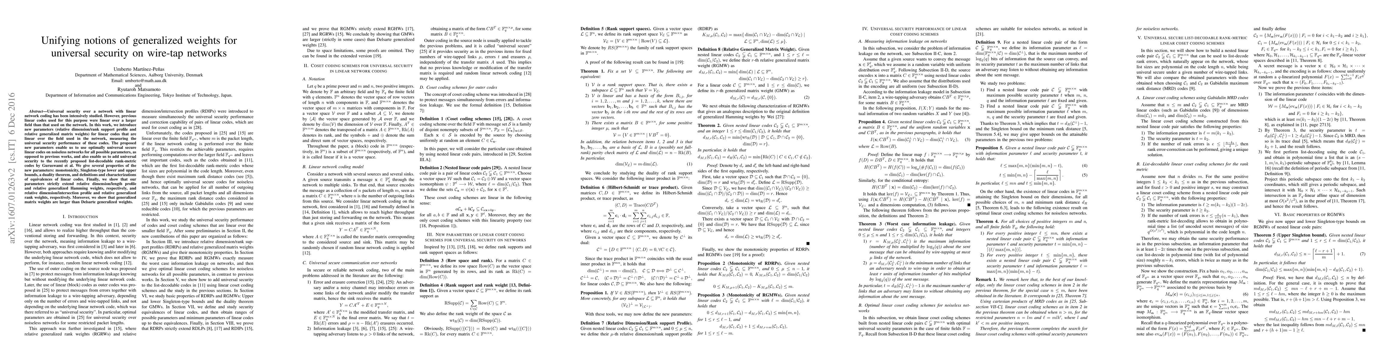 Universal security over a network with linear network coding has been intensively studied. However, previous linear codes used for this purpose were linear over a larger field than that used on the network. In this work, we introduce new parameters (relative dimension/rank support profile and relative generalized matrix weights) for linear codes that are linear over the field used in the network, measuring the universal security performance of these codes. The proposed new parameters enable us to use optimally universal secure linear codes on noiseless networks for all possible parameters, as opposed to previous works, and also enable us to add universal security to the recently proposed list-decodable rank-metric codes by Guruswami et al. We give several properties of the new parameters: monotonicity, Singleton-type lower and upper bounds, a duality theorem, and definitions and characterizations of equivalences of linear codes. Finally, we show that our parameters strictly extend relative dimension/length profile and relative generalized Hamming weights, respectively, and relative dimension/intersection profile and relative generalized rank weights, respectively. Moreover, we show that generalized matrix weights are larger than Delsarte generalized weights.
