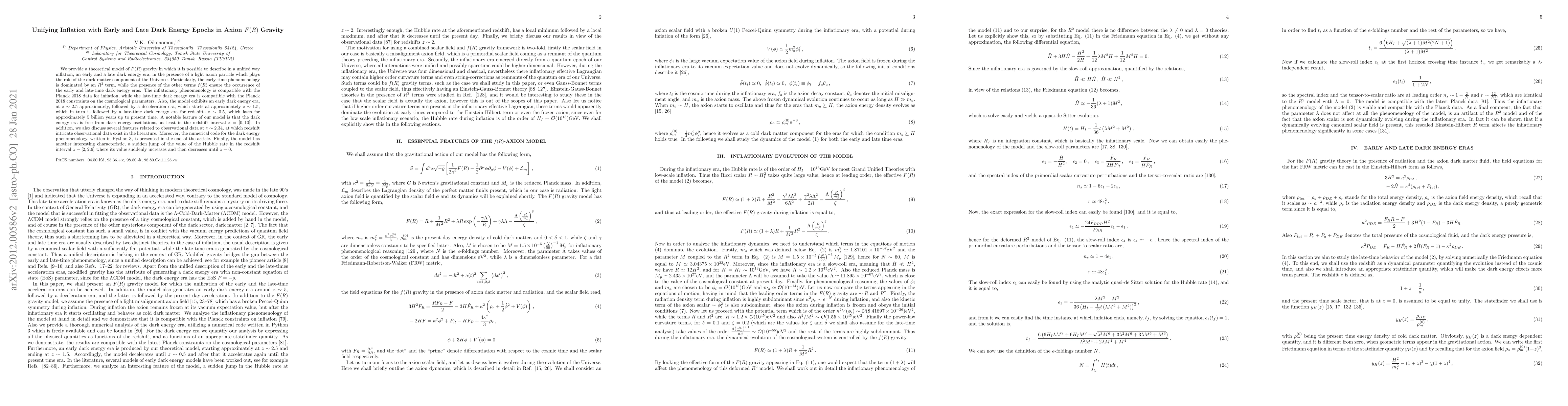 We provide a theoretical model of $F(R)$ gravity in which it is possible to describe in a unified way inflation, an early and a late dark energy era, in the presence of a light axion particle which plays the role of the dark matter component of the Universe. Particularly, the early-time phenomenology is dominated by an $R^2$ term, while the presence of the other terms $f(R)$ ensure the occurrence of the early and late-time dark energy eras. The inflationary phenomenology is compatible with the Planck 2018 data for inflation, while the late-time dark energy era is compatible with the Planck 2018 constraints on the cosmological parameters. Also, the model exhibits an early dark energy era, at $z\sim 2.5$ approximately, followed by a deceleration era, which starts at approximately $z\sim 1.5$, which in turn is followed by a late-time dark energy era for redshifts $z\sim 0.5$, which lasts for approximately 5 billion years up to present time. A notable feature of our model is that the dark energy era is free from dark energy oscillations, at least in the redshift interval $z=[0,10]$. In addition, we also discuss several features related to observational data at $z\sim 2.34$, at which redshift intricate observational data exist in the literature. Moreover, the numerical code for the dark energy phenomenology, written in Python 3, is presented in the end of the article. Finally, the model has another interesting characteristic, a sudden jump of the value of the Hubble rate in the redshift interval $z\sim [2,2.6]$ where its value suddenly increases and then decreases until $z\sim 0$.