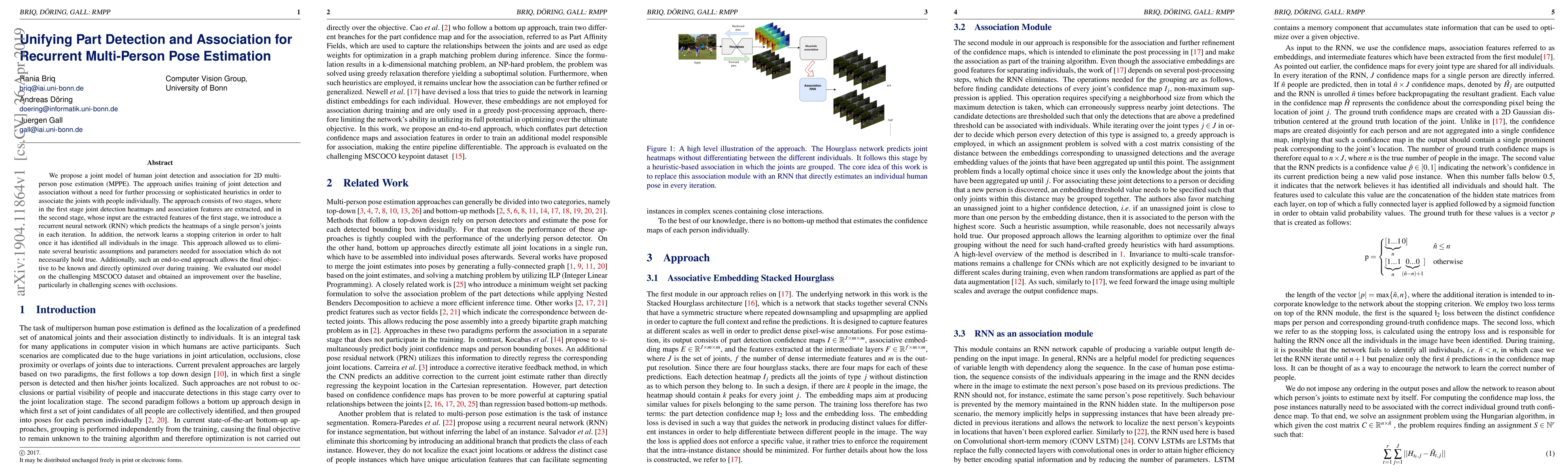 We propose a joint model of human joint detection and association for 2D multi-person pose estimation (MPPE). The approach unifies training of joint detection and association without a need for further processing or sophisticated heuristics in order to associate the joints with people individually. The approach consists of two stages, where in the first stage joint detection heatmaps and association features are extracted, and in the second stage, whose input are the extracted features of the first stage, we introduce a recurrent neural network (RNN) which predicts the heatmaps of a single person's joints in each iteration. In addition, the network learns a stopping criterion in order to halt once it has identified all individuals in the image. This approach allowed us to eliminate several heuristic assumptions and parameters needed for association which do not necessarily hold true. Additionally, such an end-to-end approach allows the final objective to be known and directly optimized over during training. We evaluated our model on the challenging MSCOCO dataset and obtained an improvement over the baseline, particularly in challenging scenes with occlusions.