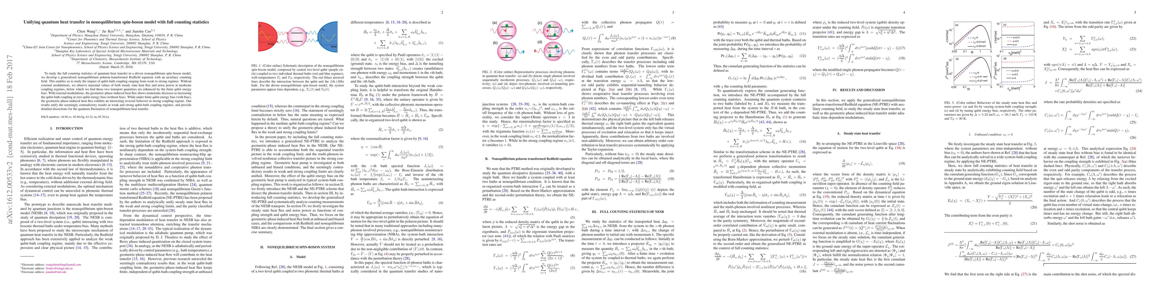 To study the full counting statistics of quantum heat transfer in a driven nonequilibrium spin-boson model, we develop a generalized nonequilibrium polaron-transformed Redfield equation with an auxiliary counting field. This enables us to study the impact of qubit-bath coupling ranging from weak to strong regimes. Without external modulations, we observe maximal values of both steady state heat flux and noise power at moderate coupling regimes, below which we find those two transport quantities are enhanced by the finite qubit energy bias. With external modulations, the geometric-phase-induced heat flux shows monotonic decrease as increasing the qubit-bath coupling at zero qubit energy bias (without bias). While under finite qubit energy bias (with bias), the geometric-phase-induced heat flux exhibits an interesting reversal behavior in strong coupling regime. Our results unify the seemingly contradictory results in weak and strong qubit-bath coupling regimes, and provide detailed dissections for the quantum fluctuation of nonequilibrium heat transfer.