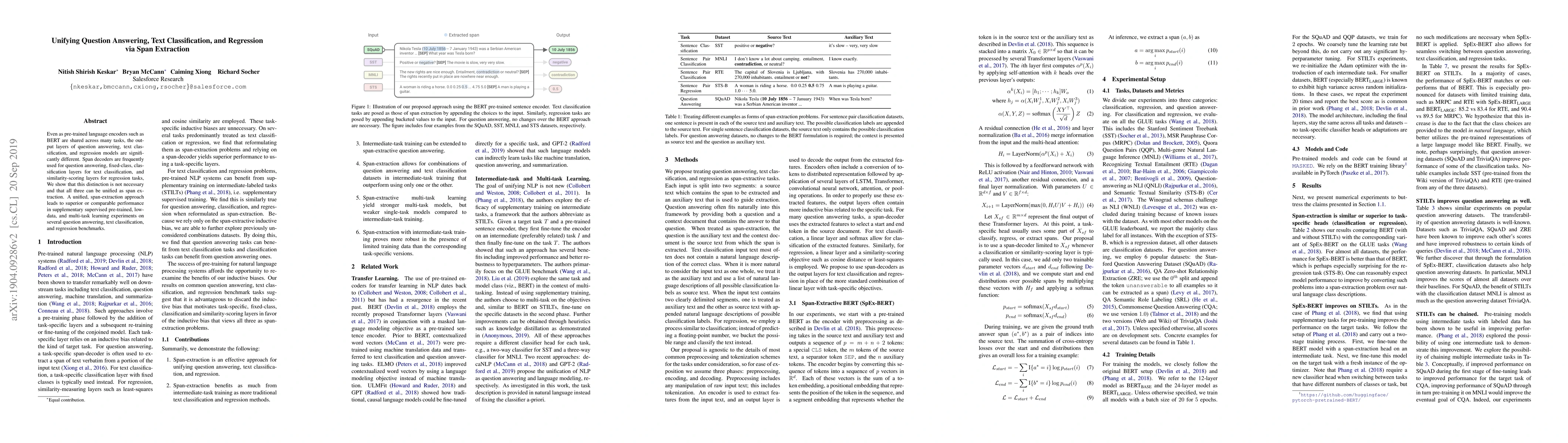 Even as pre-trained language encoders such as BERT are shared across many tasks, the output layers of question answering, text classification, and regression models are significantly different. Span decoders are frequently used for question answering, fixed-class, classification layers for text classification, and similarity-scoring layers for regression tasks, We show that this distinction is not necessary and that all three can be unified as span extraction. A unified, span-extraction approach leads to superior or comparable performance in supplementary supervised pre-trained, low-data, and multi-task learning experiments on several question answering, text classification, and regression benchmarks.