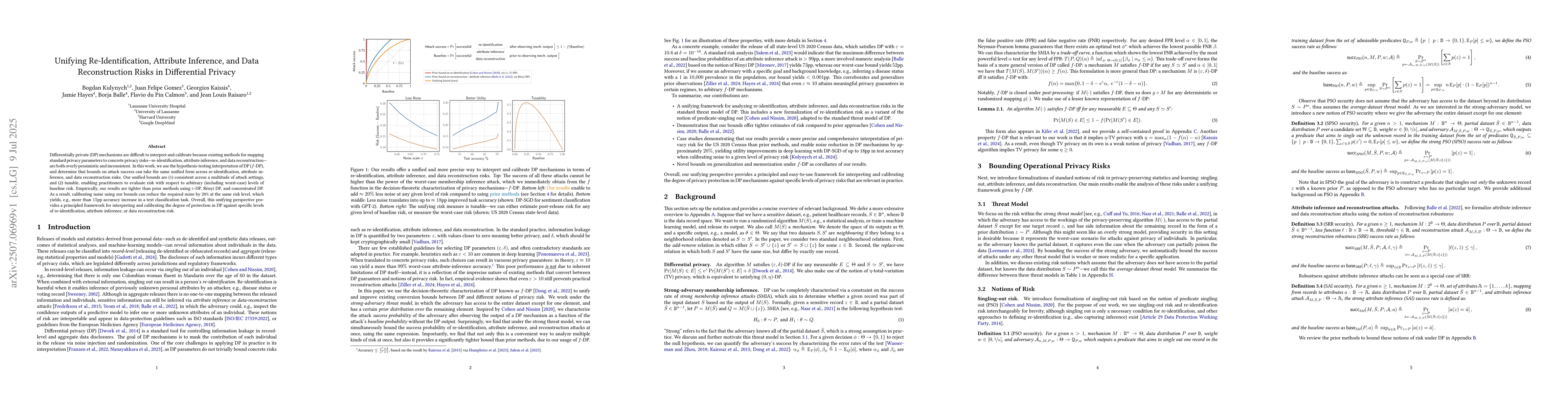 Differentially private (DP) mechanisms are difficult to interpret and calibrate because existing methods for mapping standard privacy parameters to concrete privacy risks -- re-identification, attribute inference, and data reconstruction -- are both overly pessimistic and inconsistent. In this work, we use the hypothesis-testing interpretation of DP ($f$-DP), and determine that bounds on attack success can take the same unified form across re-identification, attribute inference, and data reconstruction risks. Our unified bounds are (1) consistent across a multitude of attack settings, and (2) tunable, enabling practitioners to evaluate risk with respect to arbitrary (including worst-case) levels of baseline risk. Empirically, our results are tighter than prior methods using $\varepsilon$-DP, R\'enyi DP, and concentrated DP. As a result, calibrating noise using our bounds can reduce the required noise by 20% at the same risk level, which yields, e.g., more than 15pp accuracy increase in a text classification task. Overall, this unifying perspective provides a principled framework for interpreting and calibrating the degree of protection in DP against specific levels of re-identification, attribute inference, or data reconstruction risk.