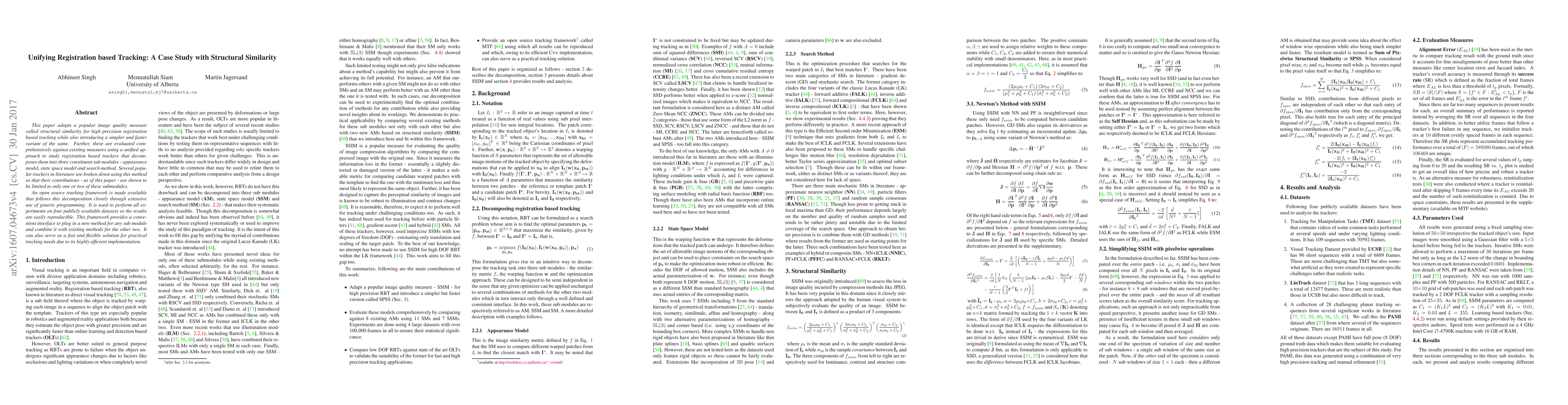 This paper adapts a popular image quality measure called structural similarity for high precision registration based tracking while also introducing a simpler and faster variant of the same. Further, these are evaluated comprehensively against existing measures using a unified approach to study registration based trackers that decomposes them into three constituent sub modules - appearance model, state space model and search method. Several popular trackers in literature are broken down using this method so that their contributions - as of this paper - are shown to be limited to only one or two of these submodules. An open source tracking framework is made available that follows this decomposition closely through extensive use of generic programming. It is used to perform all experiments on four publicly available datasets so the results are easily reproducible. This framework provides a convenient interface to plug in a new method for any sub module and combine it with existing methods for the other two. It can also serve as a fast and flexible solution for practical tracking needs due to its highly efficient implementation.