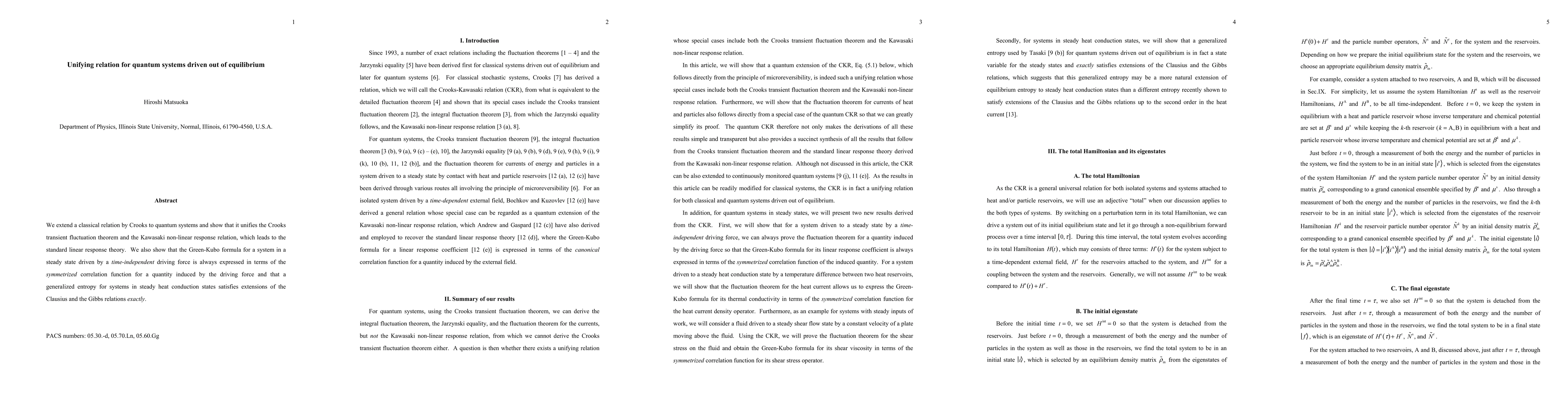 We extend a classical relation by Crooks to quantum systems and show that it unifies the Crooks transient fluctuation theorem and the Kawasaki non-linear response relation, which leads to the standard linear response theory. We also show that the Green-Kubo formula for a system in a steady state driven by a time-independent driving force is always expressed in terms of the symmetrized correlation function for a quantity induced by the driving force and that a generalized entropy for systems in steady heat conduction states satisfies extensions of the Clausius and the Gibbs relations exactly.