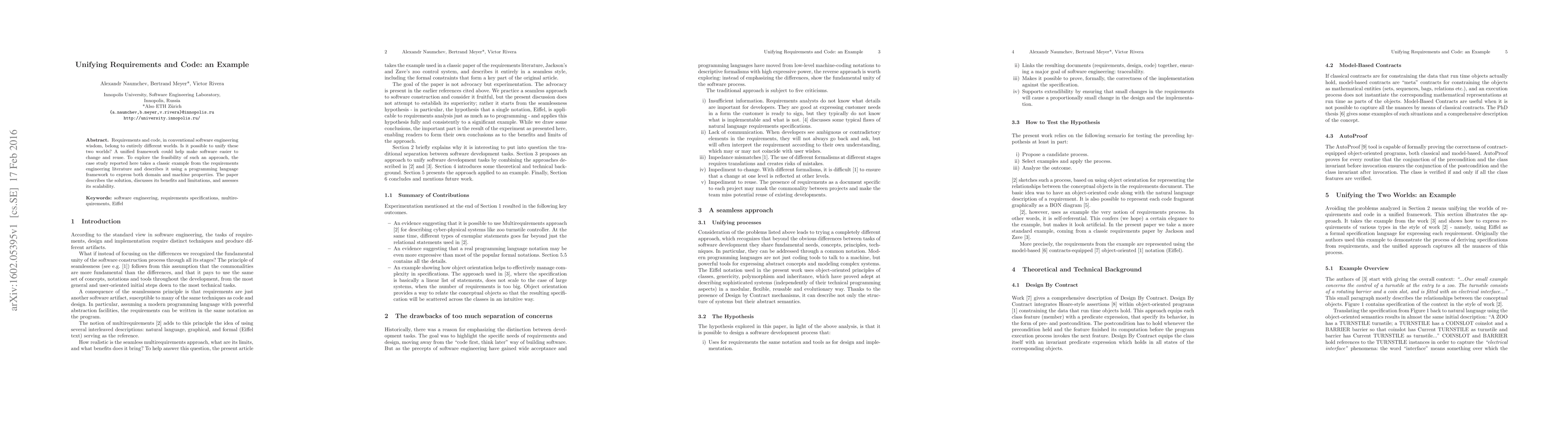 This paper explores the unification of requirements and code through a case study, demonstrating how a programming language framework can express both domain and machine properties. The study highlights the benefits and limitations of this approach, while also assessing its scalability for future applications.