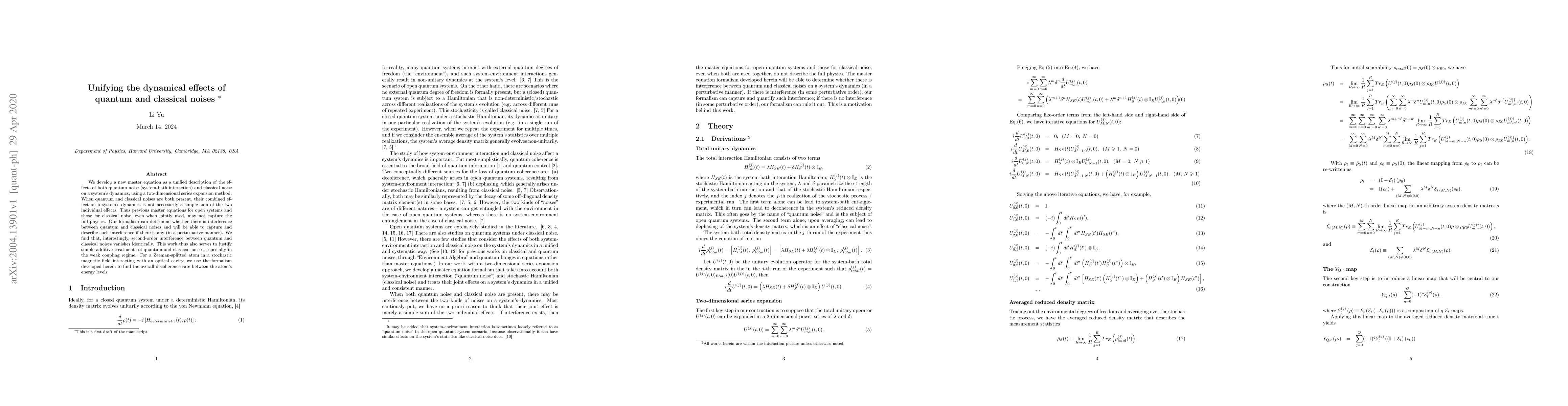 We develop a new master equation as a unified description of the effects of both quantum noise (system-bath interaction) and classical noise on a system's dynamics, using a two-dimensional series expansion method. When quantum and classical noises are both present, their combined effect on a system's dynamics is not necessarily a simple sum of the two individual effects. Thus previous master equations for open systems and those for classical noise, even when jointly used, may not capture the full physics. Our formalism can determine whether there is interference between quantum and classical noises and will be able to capture and describe such interference if there is any (in a perturbative manner). We find that, interestingly, second-order interference between quantum and classical noises vanishes identically. This work thus also serves to justify simple additive treatments of quantum and classical noises, especially in the weak coupling regime. For a Zeeman-splitted atom in a stochastic magnetic field interacting with an optical cavity, we use the formalism developed herein to find the overall decoherence rate between the atom's energy levels.