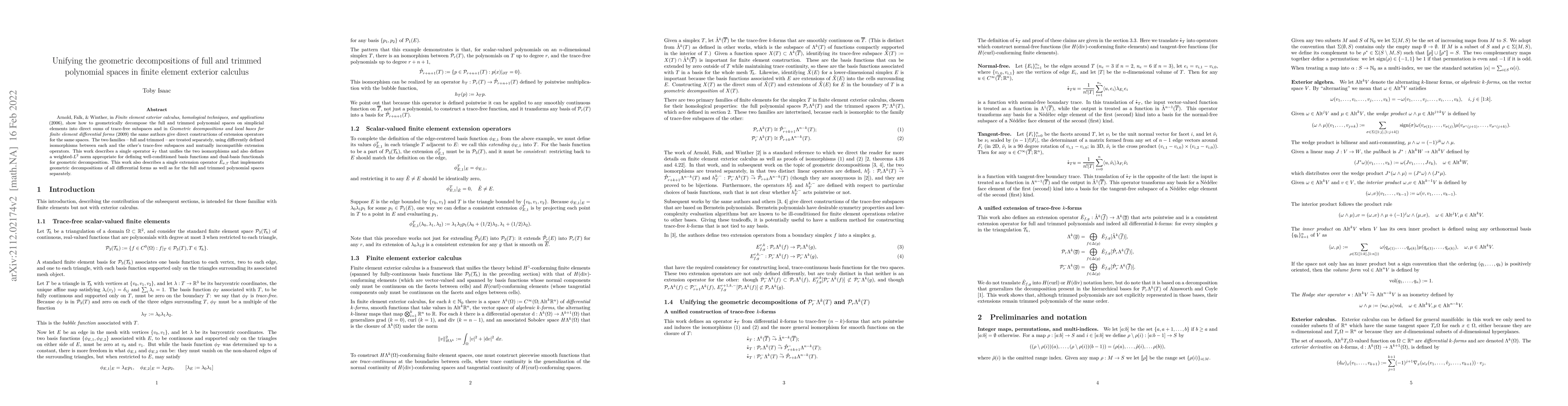 Arnold, Falk, & Winther, in "Finite element exterior calculus, homological techniques, and applications" (2006), show how to geometrically decompose the full and trimmed polynomial spaces on simplicial elements into direct sums of trace-free subspaces and in "Geometric decompositions and local bases for finite element differential forms" (2009) the same authors give direct constructions of extension operators for the same spaces. The two families -- full and trimmed -- are treated separately, using differently defined isomorphisms between each and the other's trace-free subspaces and mutually incompatible extension operators. This work describes a single operator $\mathring{\star}_T$ that unifies the two isomorphisms and also defines a weighted-$L^2$ norm appropriate for defining well-conditioned basis functions and dual-basis functionals for geometric decomposition. This work also describes a single extension operator $\dot{E}_{\sigma,T}$ that implements geometric decompositions of all differential forms as well as for the full and trimmed polynomial spaces separately.