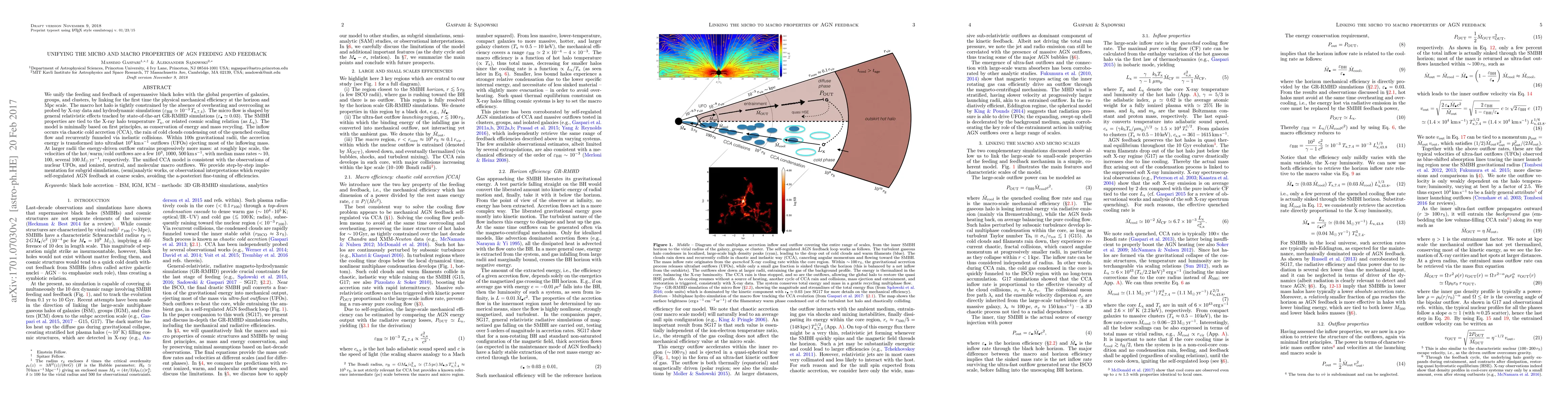 We unify the feeding and feedback of supermassive black holes with the global properties of galaxies, groups, and clusters, by linking for the first time the physical mechanical efficiency at the horizon and Mpc scale. The macro hot halo is tightly constrained by the absence of overheating and overcooling as probed by X-ray data and hydrodynamic simulations ($\varepsilon_{\rm BH} \simeq$ 10$^{-3}\, T_{\rm x,7.4}$). The micro flow is shaped by general relativistic effects tracked by state-of-the-art GR-RMHD simulations ($\varepsilon_\bullet \simeq$ 0.03). The SMBH properties are tied to the X-ray halo temperature $T_{\rm x}$, or related cosmic scaling relation (as $L_{\rm x}$). The model is minimally based on first principles, as conservation of energy and mass recycling. The inflow occurs via chaotic cold accretion (CCA), the rain of cold clouds condensing out of the quenched cooling flow and recurrently funneled via inelastic collisions. Within 100s gravitational radii, the accretion energy is transformed into ultrafast 10$^4$ km s$^{-1}$ outflows (UFOs) ejecting most of the inflowing mass. At larger radii the energy-driven outflow entrains progressively more mass: at roughly kpc scale, the velocities of the hot/warm/cold outflows are a few 10$^3$, 1000, 500 km s$^{-1}$, with median mass rates ~10, 100, several 100 M$_\odot$ yr$^{-1}$, respectively. The unified CCA model is consistent with the observations of nuclear UFOs, and ionized, neutral, and molecular macro outflows. We provide step-by-step implementation for subgrid simulations, (semi)analytic works, or observational interpretations which require self-regulated AGN feedback at coarse scales, avoiding the a-posteriori fine-tuning of efficiencies.