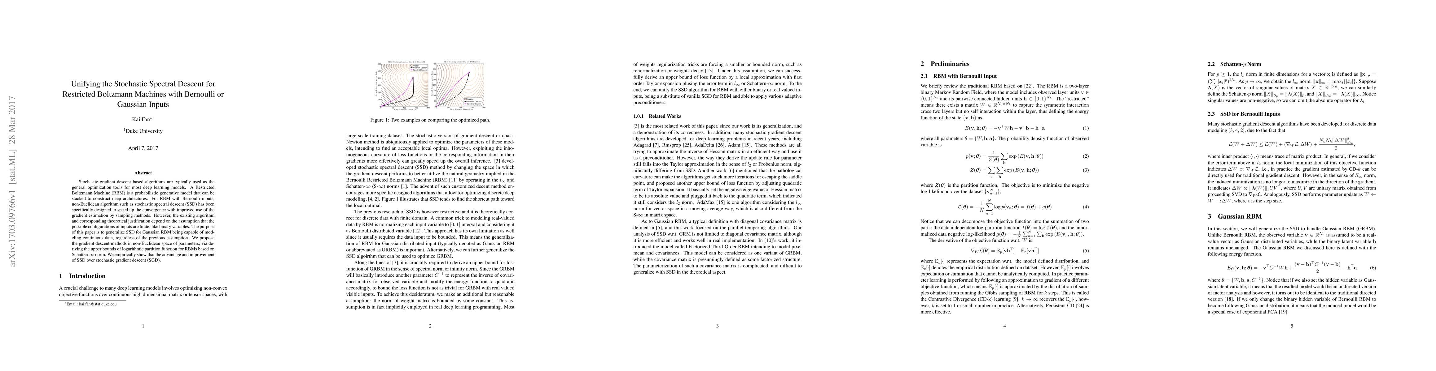Stochastic gradient descent based algorithms are typically used as the general optimization tools for most deep learning models. A Restricted Boltzmann Machine (RBM) is a probabilistic generative model that can be stacked to construct deep architectures. For RBM with Bernoulli inputs, non-Euclidean algorithm such as stochastic spectral descent (SSD) has been specifically designed to speed up the convergence with improved use of the gradient estimation by sampling methods. However, the existing algorithm and corresponding theoretical justification depend on the assumption that the possible configurations of inputs are finite, like binary variables. The purpose of this paper is to generalize SSD for Gaussian RBM being capable of mod- eling continuous data, regardless of the previous assumption. We propose the gradient descent methods in non-Euclidean space of parameters, via de- riving the upper bounds of logarithmic partition function for RBMs based on Schatten-infinity norm. We empirically show that the advantage and improvement of SSD over stochastic gradient descent (SGD).