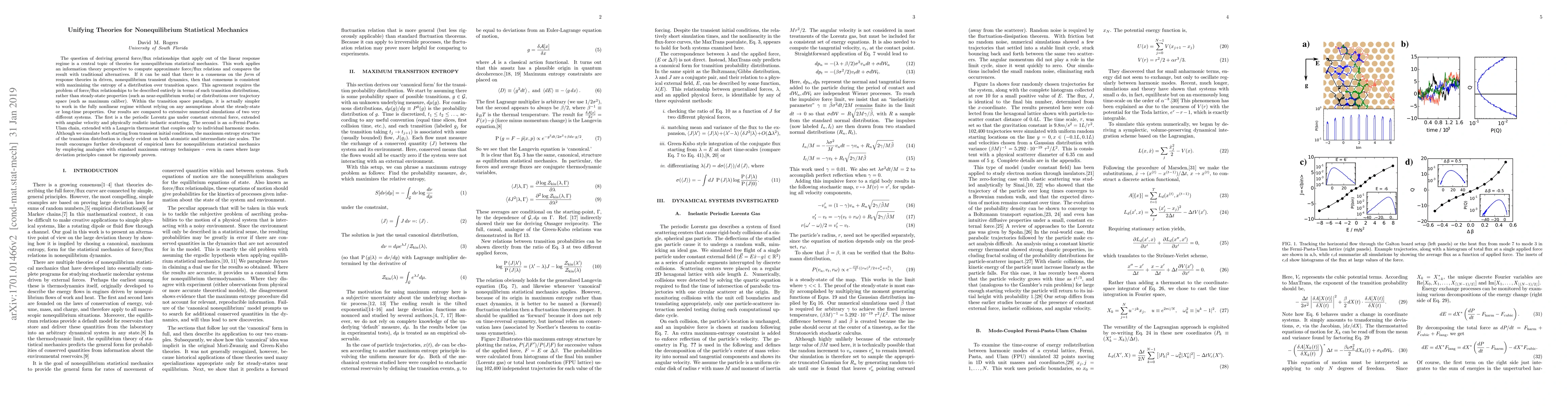 This paper explores the derivation of force/flux relationships in nonequilibrium statistical mechanics using an information theory approach, demonstrating that maximizing entropy in transition distributions provides a unifying framework. It compares these results with traditional methods and validates the theory through extensive simulations of a Lorentz gas and an $\alpha$-Fermi-Pasta-Ulam chain, showing the maximum entropy structure in both systems.