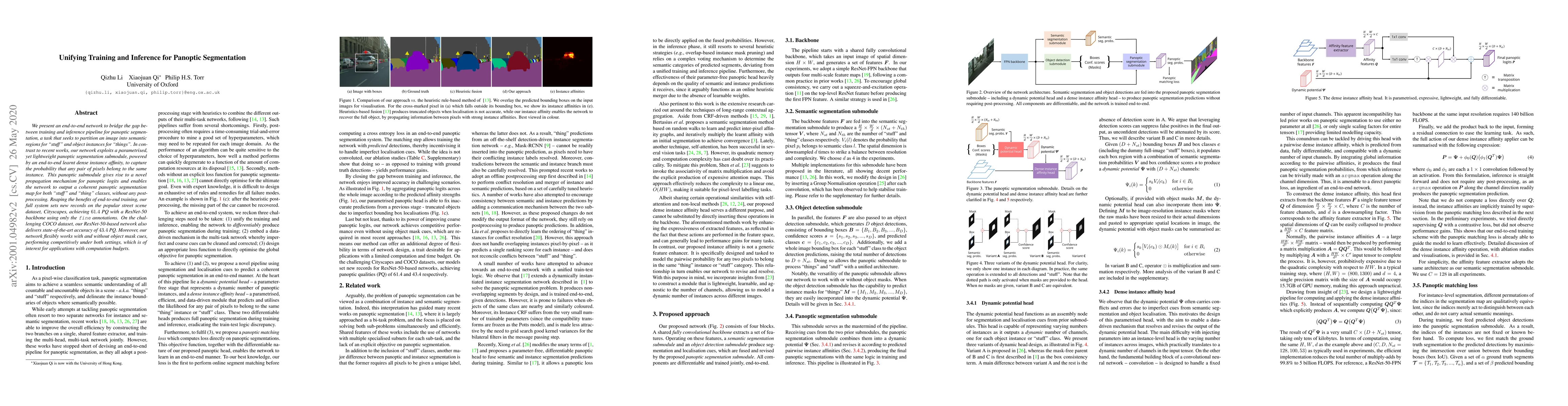 This paper introduces an end-to-end network for panoptic segmentation that unifies training and inference, achieving state-of-the-art performance on Cityscapes and COCO datasets without requiring post-processing. The network leverages a lightweight panoptic submodule and dense instance affinity for coherent segmentation.