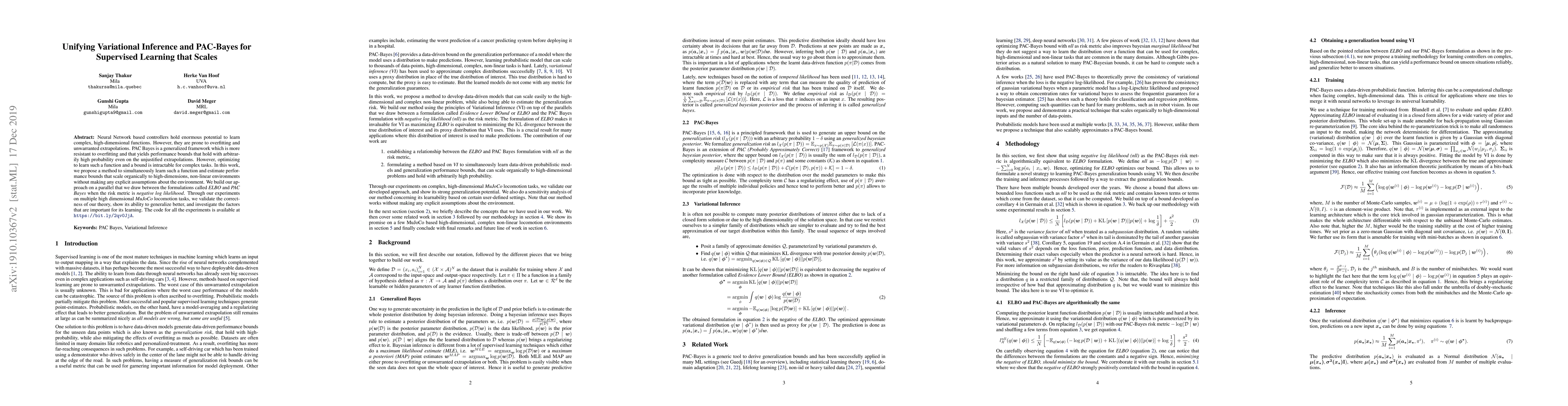This paper proposes a unified method combining variational inference and PAC-Bayes to enhance neural network learning, addressing overfitting and improving generalization in high-dimensional tasks. The approach is validated through experiments on locomotion tasks, demonstrating better generalization and performance bounds.