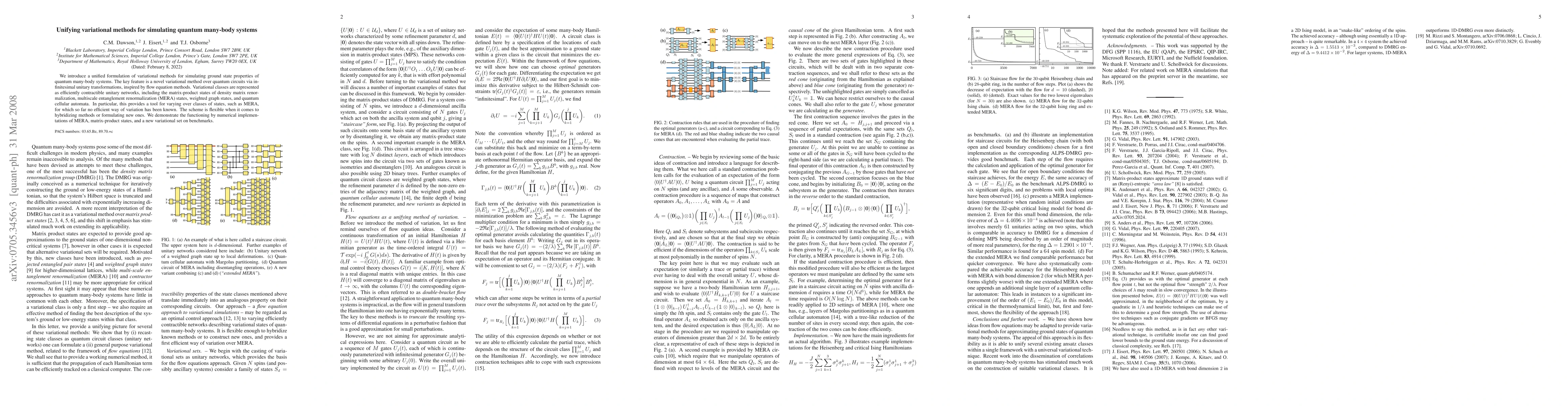 This paper presents a unified variational approach for simulating quantum many-body systems using quantum circuits and infinitesimal unitary transformations. It introduces efficiently contractible unitary networks to represent various variational classes, enabling efficient variation over states like MERA, and demonstrates its effectiveness through numerical implementations.