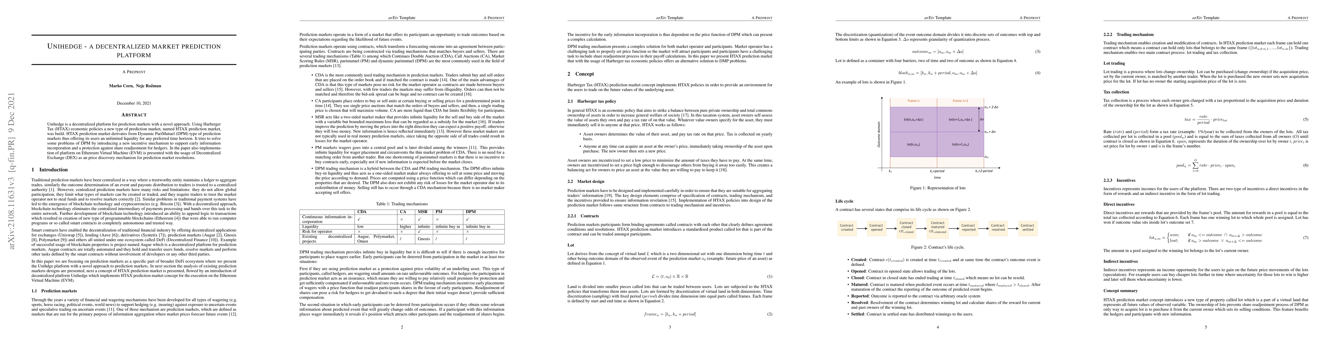 Unihedge is a decentralized platform for prediction markets with a novel approach. Using Harberger Tax (HTAX) economic policies a new type of prediction market, named HTAX prediction market, was build. HTAX prediction market derivates from Dynamic PariMutuel (DPM) type of prediction markets thus offering its users an unlimited liquidity for any preferred time horizon. It tries to solve some problems of DPM by introducing a new incentive mechanism to support early information incorporation and a protection against share readjustment for hedgers. In the paper also implementation of platform on Ethereum Virtual Machine (EVM) is presented with the usage of Decentralized Exchange (DEX) as an price discovery mechanism for prediction market resolutions.