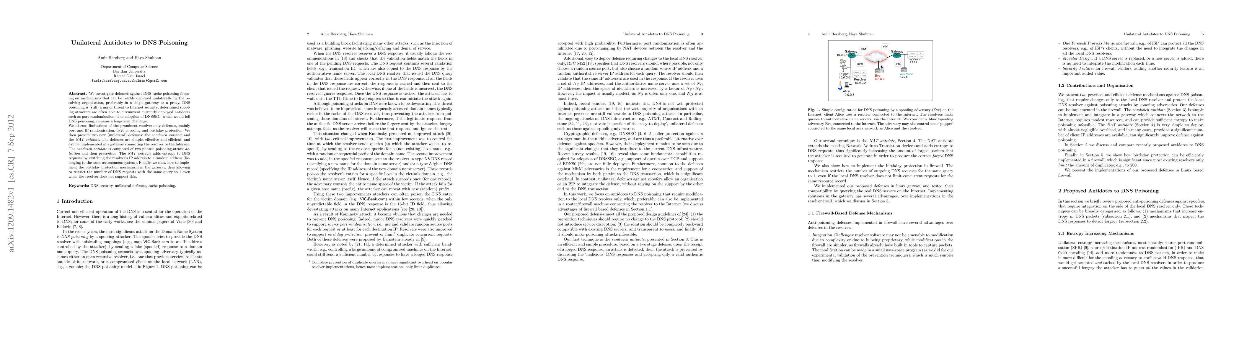 This paper explores unilateral defenses against DNS cache poisoning, emphasizing mechanisms deployable by resolving organizations through a single gateway or proxy. It introduces two new defenses—the sandwich antidote and the NAT antidote—and discusses limitations of existing defenses like port and IP randomization.