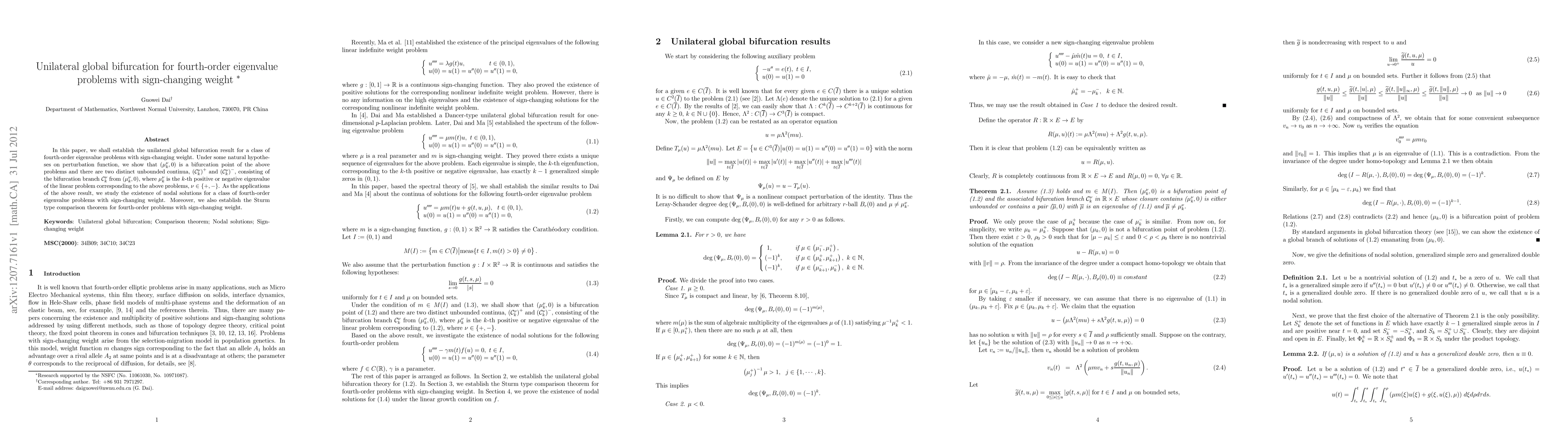 This paper establishes a unilateral global bifurcation result for fourth-order eigenvalue problems with sign-changing weights, proving the existence of two distinct unbounded continua branching from a bifurcation point. Applications include the existence of nodal solutions and a Sturm comparison theorem for such problems.