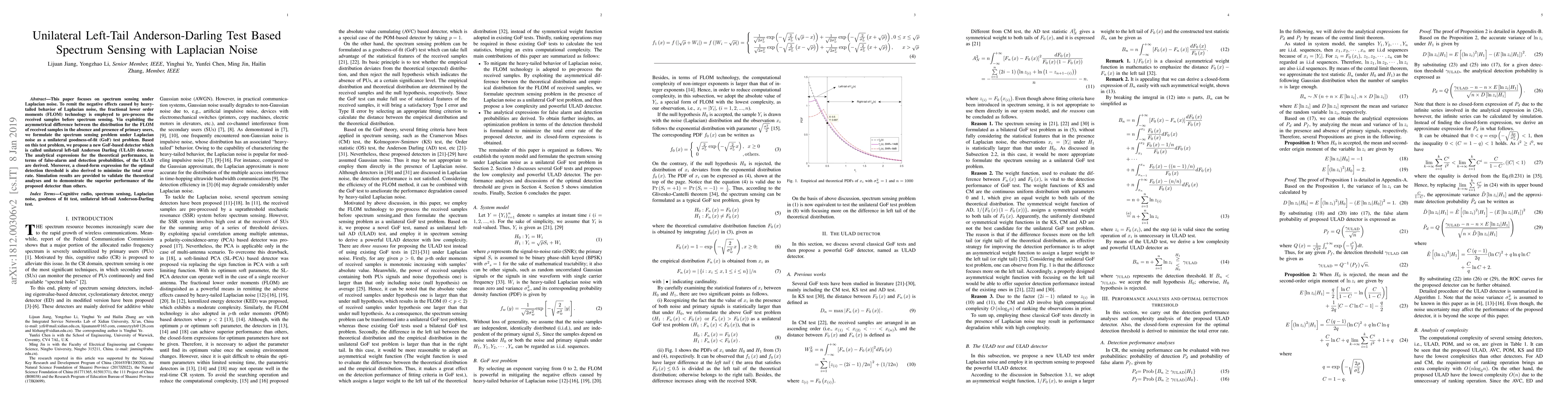 This paper focuses on spectrum sensing under Laplacian noise. To remit the negative effects caused by heavy-tailed behavior of Laplacian noise, the fractional lower order moments (FLOM) technology is employed to pre-process the received samples before spectrum sensing. Via exploiting the asymmetrical difference between the distribution for the FLOM of received samples in the absence and presence of primary users, we formulate the spectrum sensing problem under Laplacian noise as a unilateral goodness-of-fit (GoF) test problem. Based on this test problem, we propose a new GoF-based detector which is called unilateral left-tail Anderson Darling (ULAD) detector. The analytical expressions for the theoretical performance, in terms of false-alarm and detection probabilities, of the ULAD are derived. Moreover, a closed-form expression for the optimal detection threshold is also derived to minimize the total error rate. Simulation results are provided to validate the theoretical analyses and to demonstrate the superior performance of the proposed detector than others.