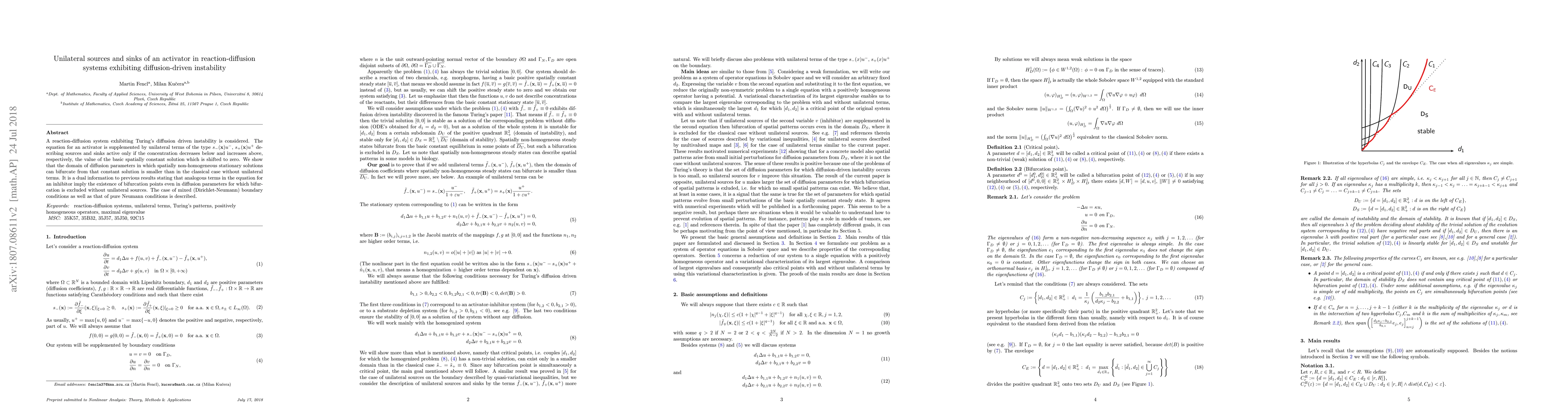 This paper investigates reaction-diffusion systems with unilateral sources and sinks for an activator, showing that these terms reduce the parameter domain for bifurcation to non-homogeneous stationary solutions compared to classical systems. It also examines the impact of different boundary conditions on the system's behavior.