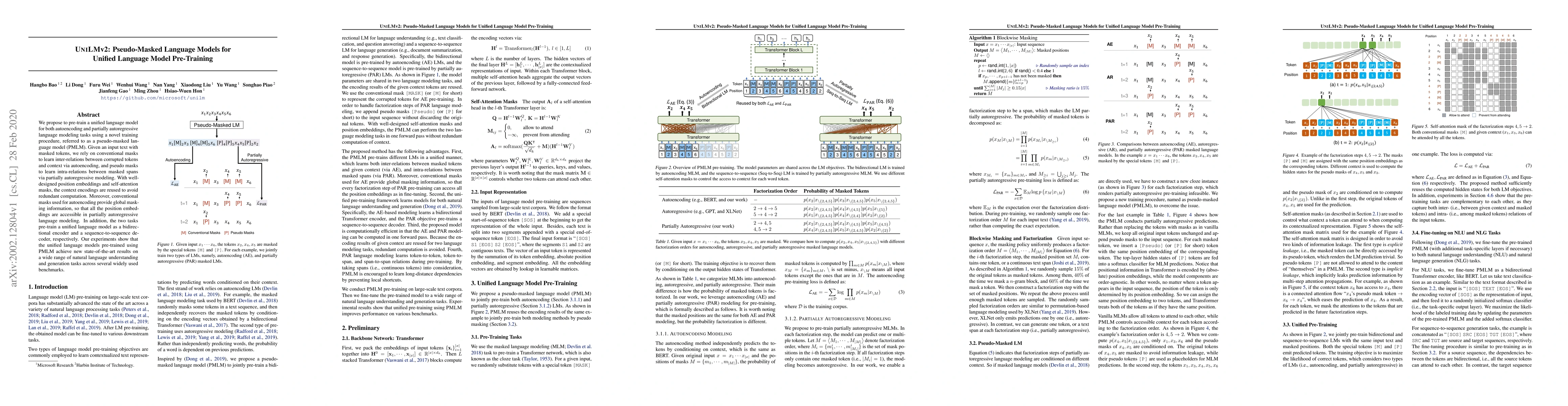 UniLMv2 introduces a pseudo-masked language model (PMLM) for unified pre-training in autoencoding and partially autoregressive tasks, achieving state-of-the-art results across various NLP benchmarks. The method leverages both conventional and pseudo masks to optimize computational efficiency and model performance.