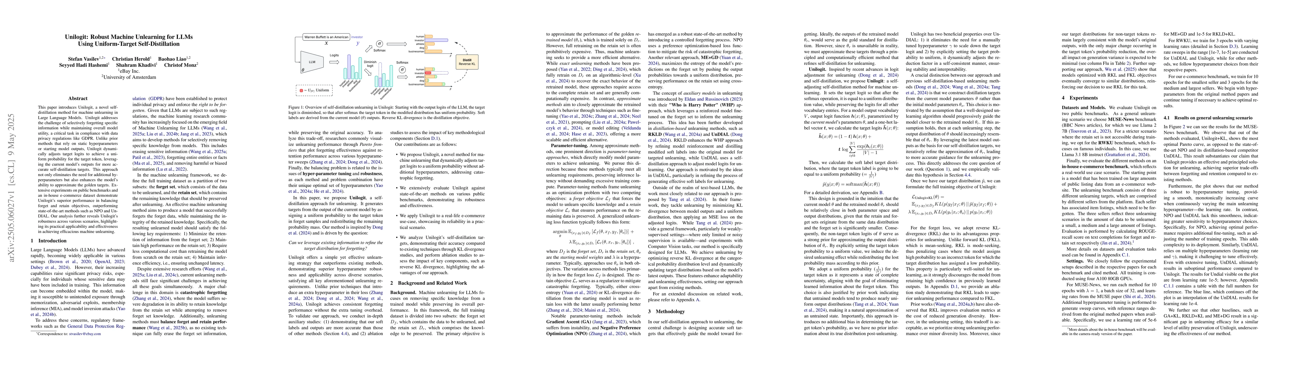 This paper introduces Unilogit, a novel self-distillation method for machine unlearning in Large Language Models. Unilogit addresses the challenge of selectively forgetting specific information while maintaining overall model utility, a critical task in compliance with data privacy regulations like GDPR. Unlike prior methods that rely on static hyperparameters or starting model outputs, Unilogit dynamically adjusts target logits to achieve a uniform probability for the target token, leveraging the current model's outputs for more accurate self-distillation targets. This approach not only eliminates the need for additional hyperparameters but also enhances the model's ability to approximate the golden targets. Extensive experiments on public benchmarks and an in-house e-commerce dataset demonstrate Unilogit's superior performance in balancing forget and retain objectives, outperforming state-of-the-art methods such as NPO and UnDIAL. Our analysis further reveals Unilogit's robustness across various scenarios, highlighting its practical applicability and effectiveness in achieving efficacious machine unlearning.