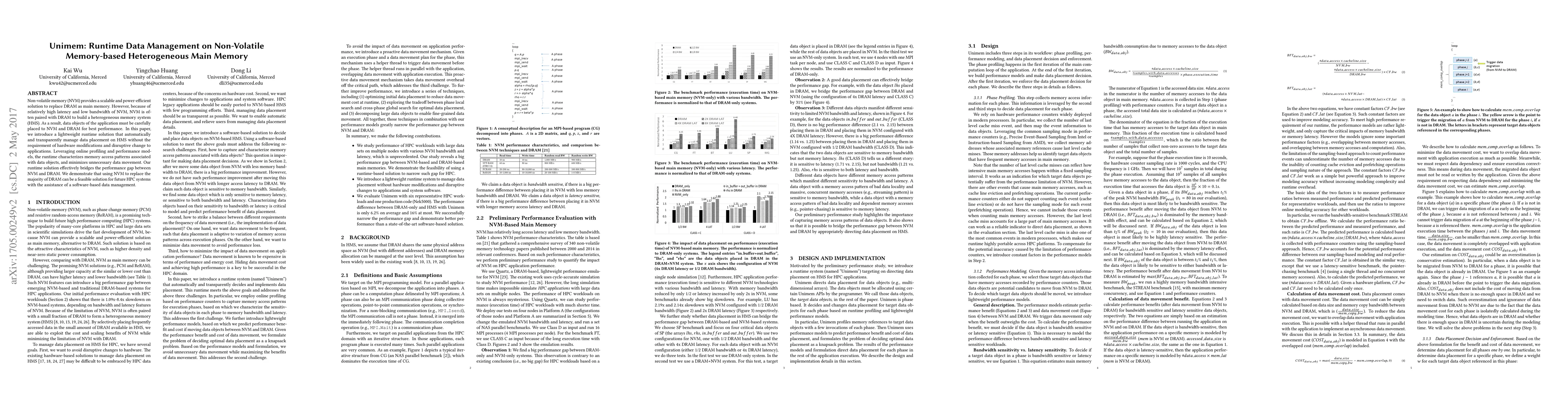 Unimem is a runtime solution for managing data placement on heterogeneous memory systems (HMS) that combine non-volatile memory (NVM) and DRAM. It automatically optimizes data distribution without requiring hardware changes or application modifications, effectively bridging the performance gap between NVM and DRAM.