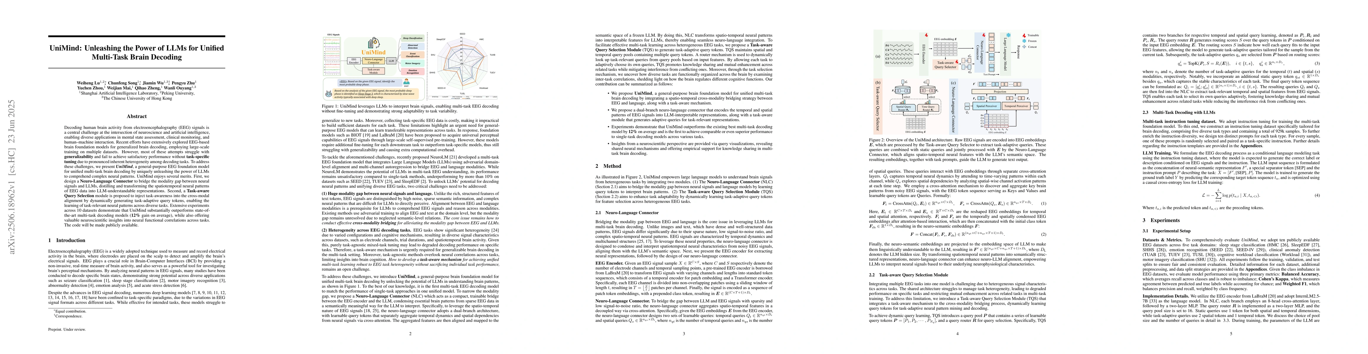 Decoding human brain activity from electroencephalography (EEG) signals is a central challenge at the intersection of neuroscience and artificial intelligence, enabling diverse applications in mental state assessment, clinical monitoring, and human-machine interaction. Recent efforts have extensively explored EEG-based brain foundation models for generalized brain decoding, employing large-scale training on multiple datasets. However, most of these attempts struggle with generalizability and fail to achieve satisfactory performance without task-specific tuning due to pronounced inherent heterogeneity among decoding tasks. To address these challenges, we present UniMind, a general-purpose EEG foundation model for unified multi-task brain decoding by uniquely unleashing the power of large language models to comprehend complex neural patterns. UniMind offers several advantages. First, we design a Neuro-Language Connector to bridge the modality gap between neural signals and large language models, distilling and transforming the spatiotemporal neural patterns of EEG data into representations understandable by language models. Second, a Task-aware Query Selection module is proposed to inject task-awareness into the cross-modal alignment by dynamically generating task-adaptive query tokens, enabling learning of task-relevant neural patterns across diverse tasks. Extensive experiments across ten datasets demonstrate that UniMind substantially outperforms state-of-the-art multi-task decoding models, with an average gain of 12 percent, while also offering valuable neuroscientific insights into neural functional correlations across tasks. The code will be made publicly available.