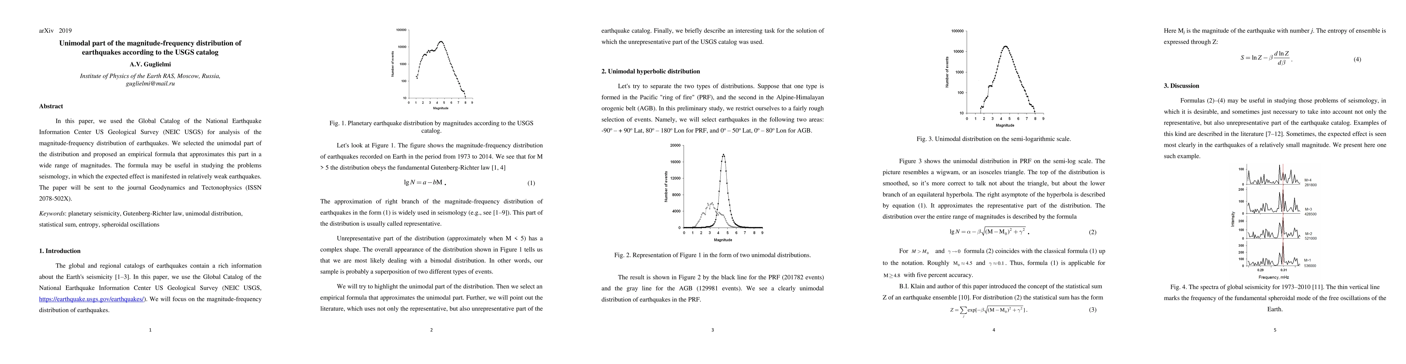 This paper analyzes the unimodal part of the magnitude-frequency distribution of earthquakes from the USGS catalog, proposing an empirical formula to approximate this segment. The formula is potentially useful for studying seismology, particularly in understanding the effects of relatively weaker earthquakes.