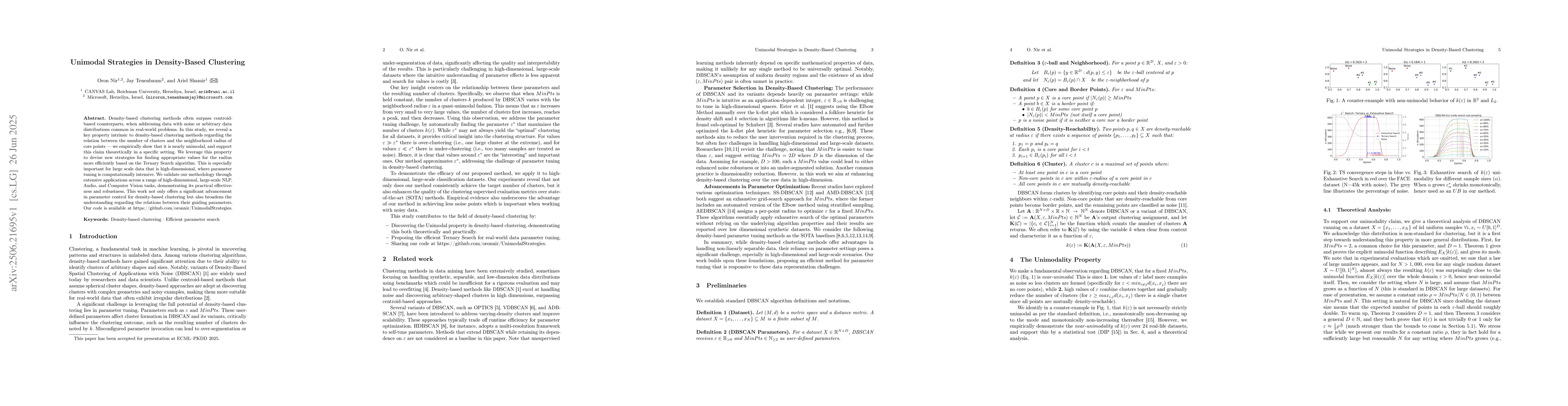 Density-based clustering methods often surpass centroid-based counterparts, when addressing data with noise or arbitrary data distributions common in real-world problems. In this study, we reveal a key property intrinsic to density-based clustering methods regarding the relation between the number of clusters and the neighborhood radius of core points - we empirically show that it is nearly unimodal, and support this claim theoretically in a specific setting. We leverage this property to devise new strategies for finding appropriate values for the radius more efficiently based on the Ternary Search algorithm. This is especially important for large scale data that is high-dimensional, where parameter tuning is computationally intensive. We validate our methodology through extensive applications across a range of high-dimensional, large-scale NLP, Audio, and Computer Vision tasks, demonstrating its practical effectiveness and robustness. This work not only offers a significant advancement in parameter control for density-based clustering but also broadens the understanding regarding the relations between their guiding parameters. Our code is available at https://github.com/oronnir/UnimodalStrategies.