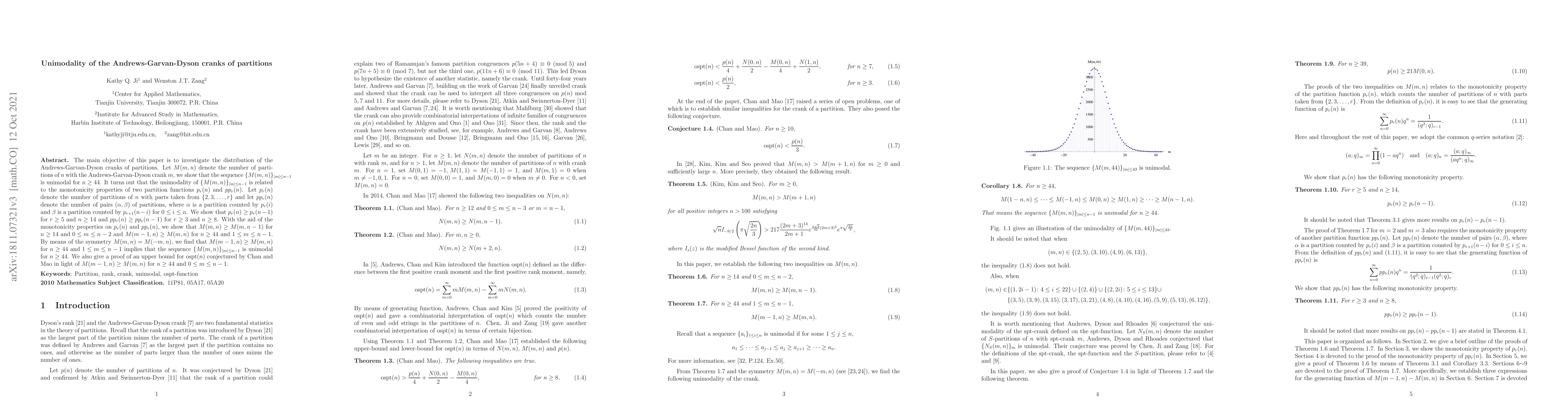 Researchers show that a specific sequence related to partitions is unimodal for n >= 44, suggesting a connection between partition functions and the distribution of certain crank values.