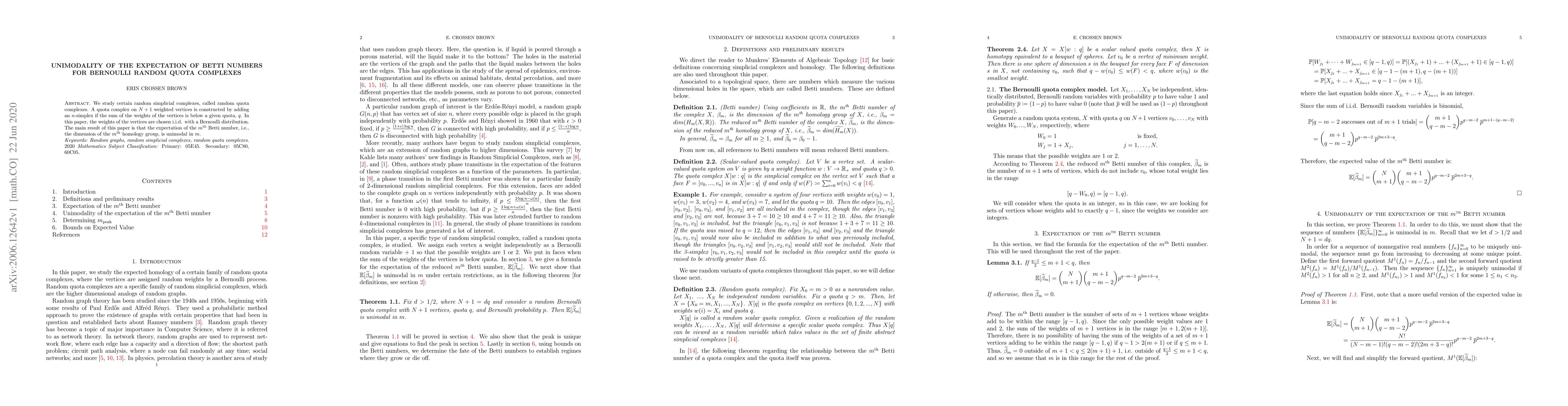 The expectation of Betti numbers for Bernoulli quota complexes is unimodal in m, meaning it has a single peak, which suggests an optimal structure for the complex at certain dimension m.