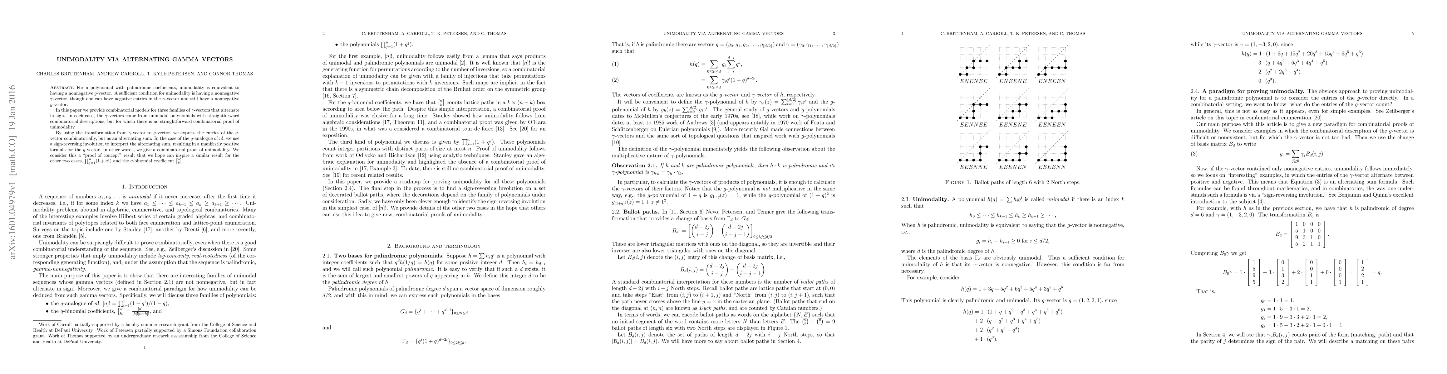 For a polynomial with palindromic coefficients, unimodality is equivalent to having a nonnegative $g$-vector. A sufficient condition for unimodality is having a nonnegative $\gamma$-vector, though one can have negative entries in the $\gamma$-vector and still have a nonnegative $g$-vector. In this paper we provide combinatorial models for three families of $\gamma$-vectors that alternate in sign. In each case, the $\gamma$-vectors come from unimodal polynomials with straightforward combinatorial descriptions, but for which there is no straightforward combinatorial proof of unimodality. By using the transformation from $\gamma$-vector to $g$-vector, we express the entries of the $g$-vector combinatorially, but as an alternating sum. In the case of the $q$-analogue of $n!$, we use a sign-reversing involution to interpret the alternating sum, resulting in a manifestly positive formula for the $g$-vector. In other words, we give a combinatorial proof of unimodality. We consider this a "proof of concept" result that we hope can inspire a similar result for the other two cases, $\prod_{j=1}^n (1+q^j)$ and the $q$-binomial coefficients.