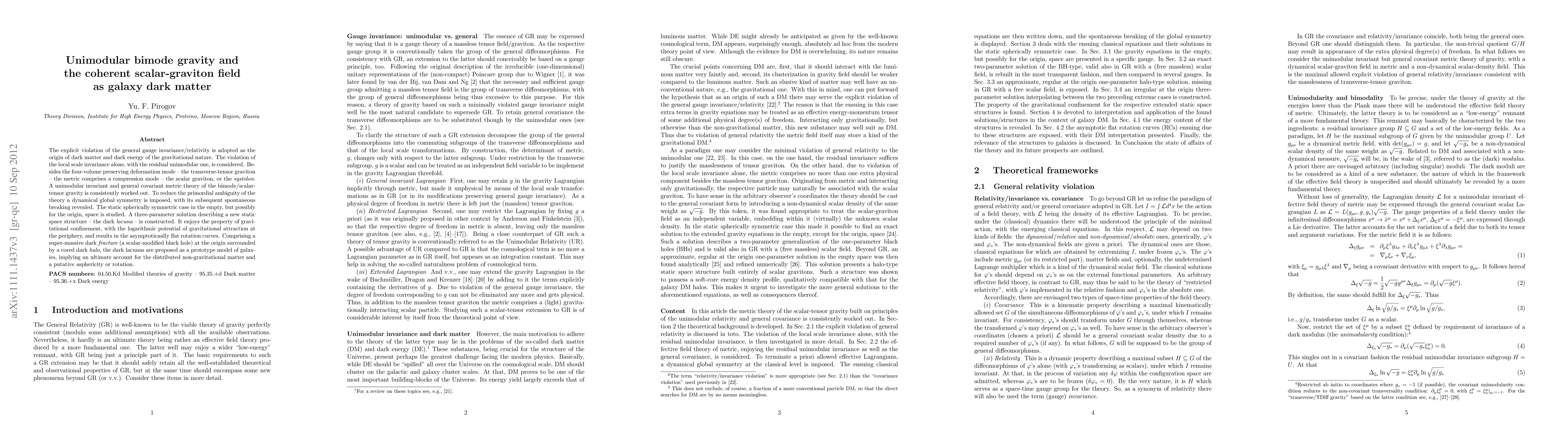 The explicit violation of the general gauge invariance/relativity is adopted as the origin of dark matter and dark energy of the gravitational nature. The violation of the local scale invariance alone, with the residual unimodular one, is considered. Besides the four-volume preserving deformation mode -- the transverse-tensor graviton -- the metric comprises a compression mode -- the scalar graviton, or the systolon. A unimodular invariant and general covariant metric theory of the bimode/scalar-tensor gravity is consistently worked out. To reduce the primordial ambiguity of the theory a dynamical global symmetry is imposed, with its subsequent spontaneous breaking revealed. The static spherically symmetric case in the empty, but possibly for the origin, space is studied. A three-parameter solution describing a new static space structure -- the dark lacuna -- is constructed. It enjoys the property of gravitational confinement, with the logarithmic potential of gravitational attraction at the periphery, and results in the asymptotically flat rotation curves. Comprising a super-massive dark fracture (a scalar-modified black hole) at the origin surrounded by a cored dark halo, the dark lacunas are proposed as a prototype model of galaxies, implying an ultimate account for the distributed non-gravitational matter and a putative asphericity or rotation.